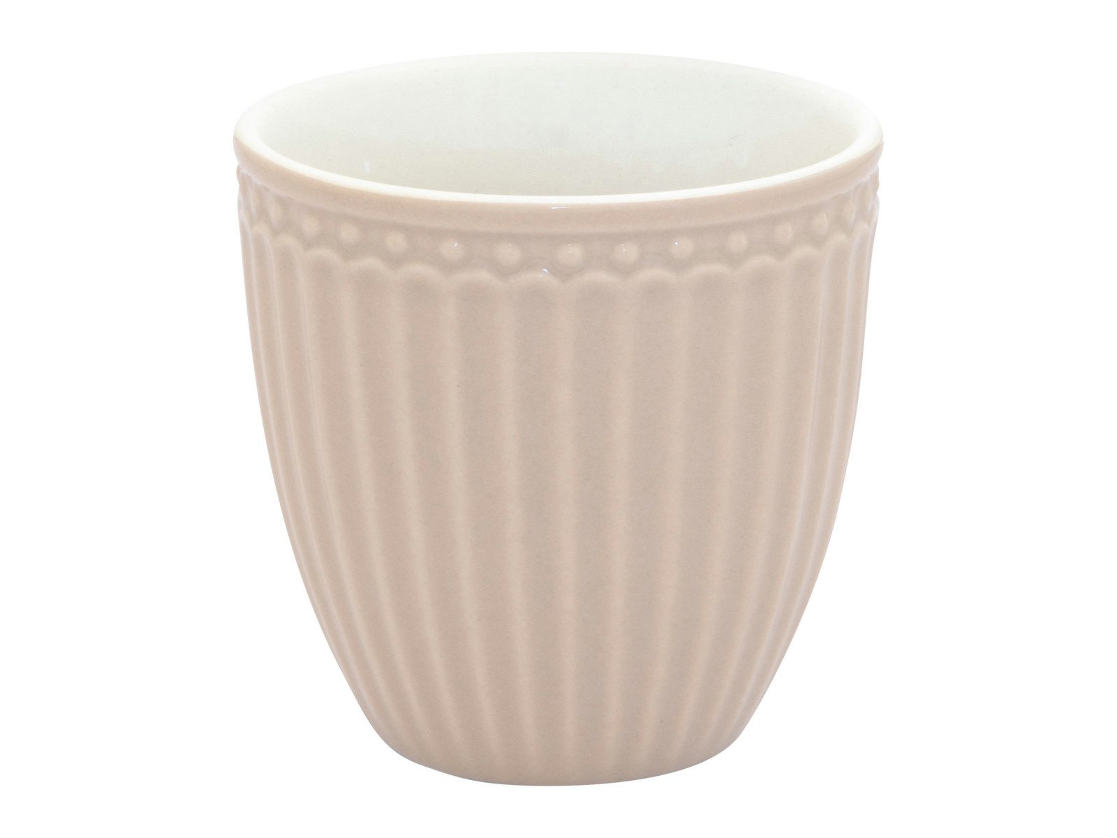 Der Greengate Alice Mini Latte Cup in der Farbe Creamy Fudge ist ein charmantes und praktisches Geschirrstück für Kaffeeliebhaber. Mit einem Fassungsvermögen von 0,1 Litern eignet er sich ideal für Espresso, kleine Kaffeespezialitäten oder Desserts. Die warme, cremige Beige-Braun-Nuance verleiht dem Becher eine zeitlose Eleganz und lässt sich wunderbar mit anderen Farben und Geschirrstücken der Alice-Serie kombinieren. Gefertigt aus hochwertigem Steingut, überzeugt er durch seine Robustheit und angenehme Haptik. Die charakteristische geriffelte Struktur sorgt für eine stilvolle Optik und macht den Mini Latte Cup zu einem besonderen Hingucker. Mit seinen kompakten Maßen von 7 x 7 cm liegt er gut in der Hand und ist perfekt für den täglichen Genuss oder besondere Kaffeemomente.