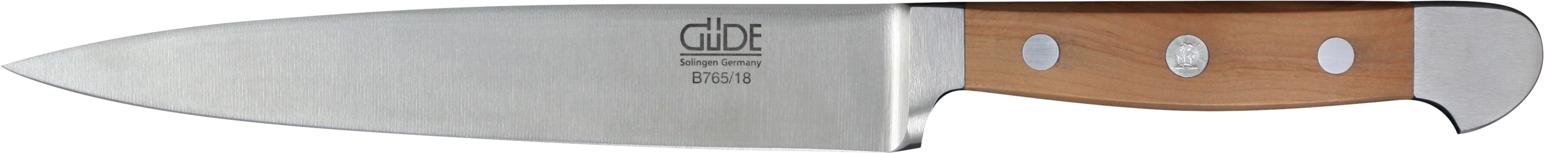 Hochwertige Messer müssen nicht nur scharf sein, sie müssen scharf bleiben, sie sollen gut in der Hand liegen und ausbalanciert sein, damit ermüdungsfreies und jederzeit sicheres Arbeiten garantiert ist. Die optimale Schärfe und Schneidhaltigkeit der Serie Alpha Birne wird sowohl durch die Härte des GÜDE Klingenstahls mit ca. 57-58 HRc (Rockwell) als auch durch den GÜDE Watenwinkel von ca. 33 Grad sichergestellt. Die Griff-Form, der durchgehende Erl und der für GÜDE unverkennbare Doppelkropf machen aus den Messern der Serie Alpha Birne ein Werkzeug, das perfekte Handhabung und Ausbalancierung garantiert.