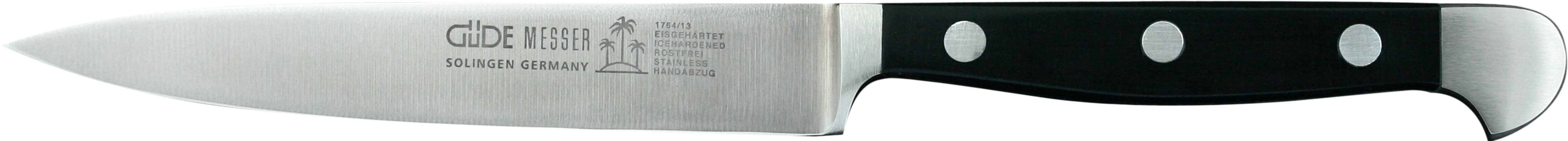 Material An das Klingenmaterial von Messern sind eine Fülle von Anforderungen zu stellen, die sich zum Teil widersprechen. Also gilt es, ein Optimum zwischen den verschiedenen Anforderungen zu realisieren. So soll ein Messerstahl hart sein, jedoch nicht zu hart, da er ansonsten brechen würde. Er soll aber auch nicht zu weich sein, da das Messer sonst durch Abnutzung zu schnell stumpf werden würde. Daher sind die Messer der Serie Alpha von GÜDE aus einem Chrom- Molybdän-Vanadium-Messerstahl gefertigt, der eine optimale Härte von ca. 57-58 HRc (Rockwell) hat.