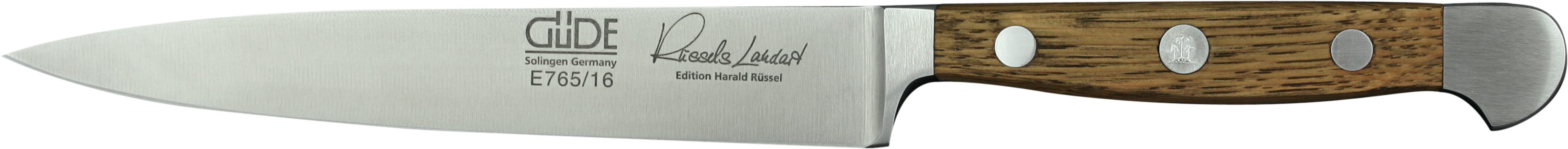 Ein gutes Messer sollte nicht nur scharf sein, es sollte auch möglichst lange scharf bleiben. Ein gutes Messer soll darüber hinaus gut in der Hand liegen und ausbalanciert sein, so dass ermüdungsfreies und jederzeit sicheres Arbeiten garantiert ist. Schärfe und Schneidhaltigkeit der Serie Alpha Fasseiche werden sowohl durch die optimale Härte des GÜDE Klingenstahls mit ca. 57-58 HRc (Rockwell) wie auch durch den GÜDE Watenwinkel von ca. 33 Grad sichergestellt. Die Form des Griffes, der Voll-Erl und der für GÜDE typische Doppelkropf machen aus den Messern der Serie Alpha Fasseiche ein zuverlässiges Werkzeug, das perfekte Handhabung und Ausbalancierung garantiert.