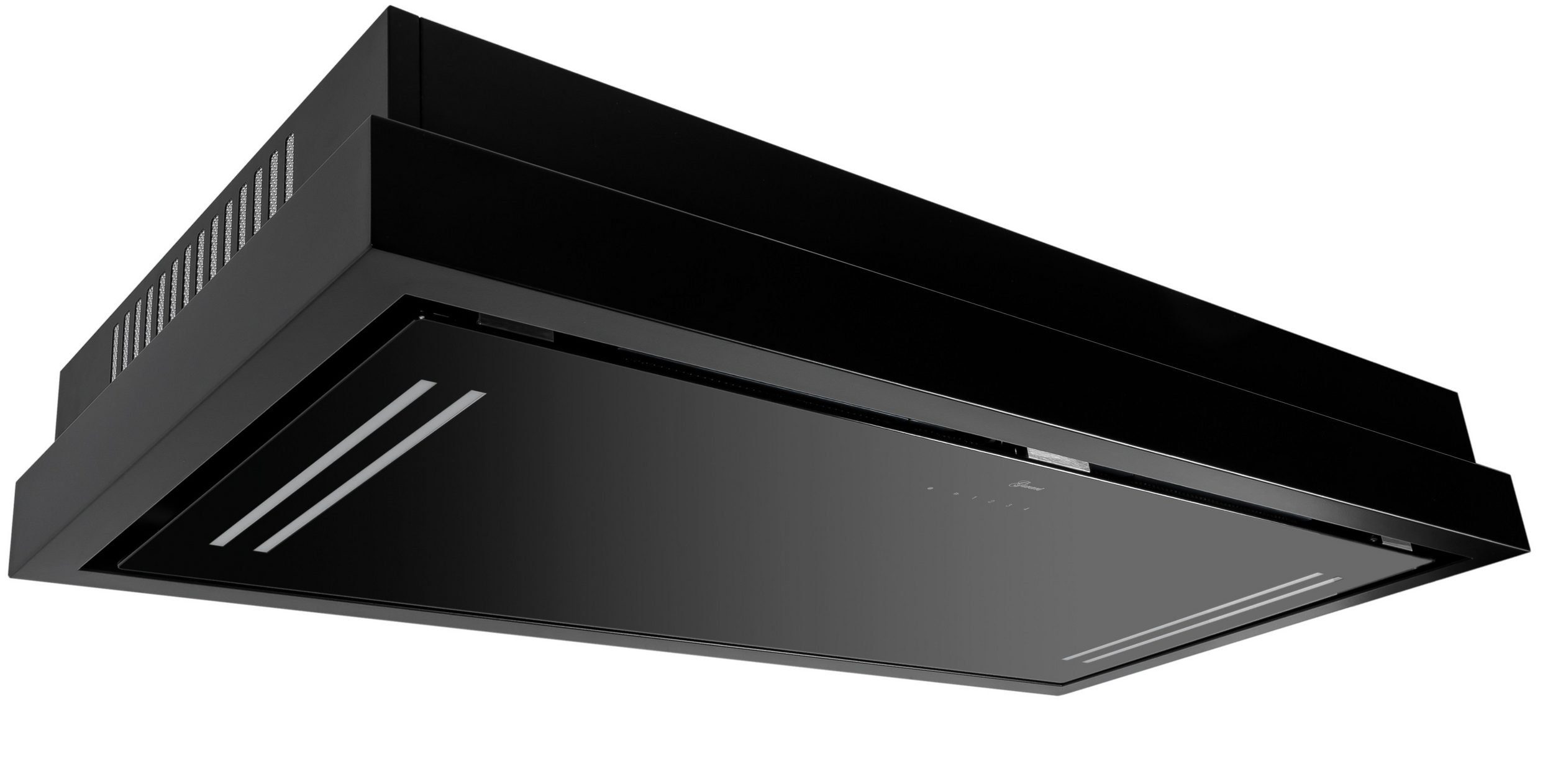 Luxus Umluft Deckenhaube mit Ionisierung in Schwarz/ Schwarz Glas Ausführung.