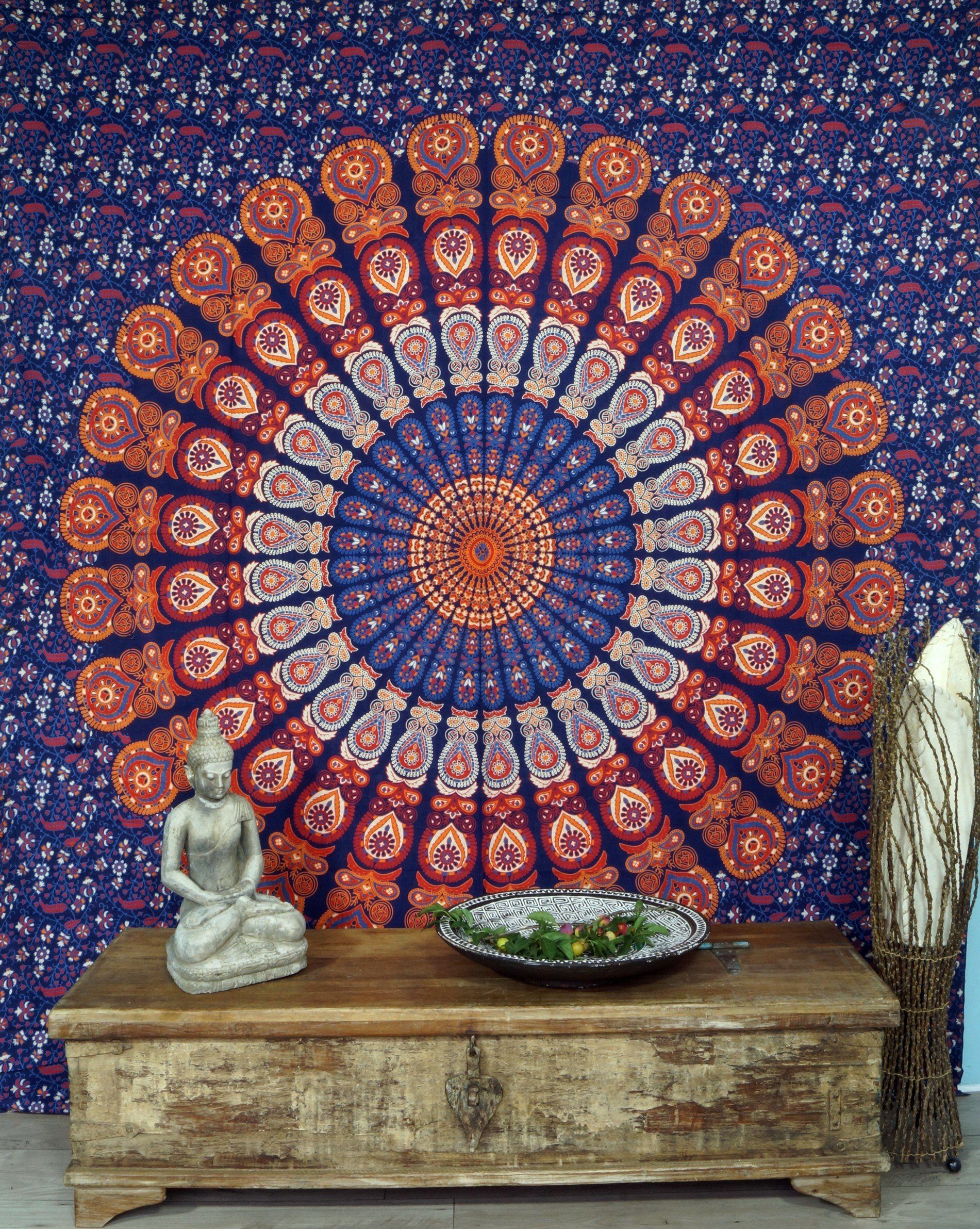 Boho-Style Wandbehang, indische Tagesdecke Mandala Druck- blau/orange/lila | 230*210*0,2 cm