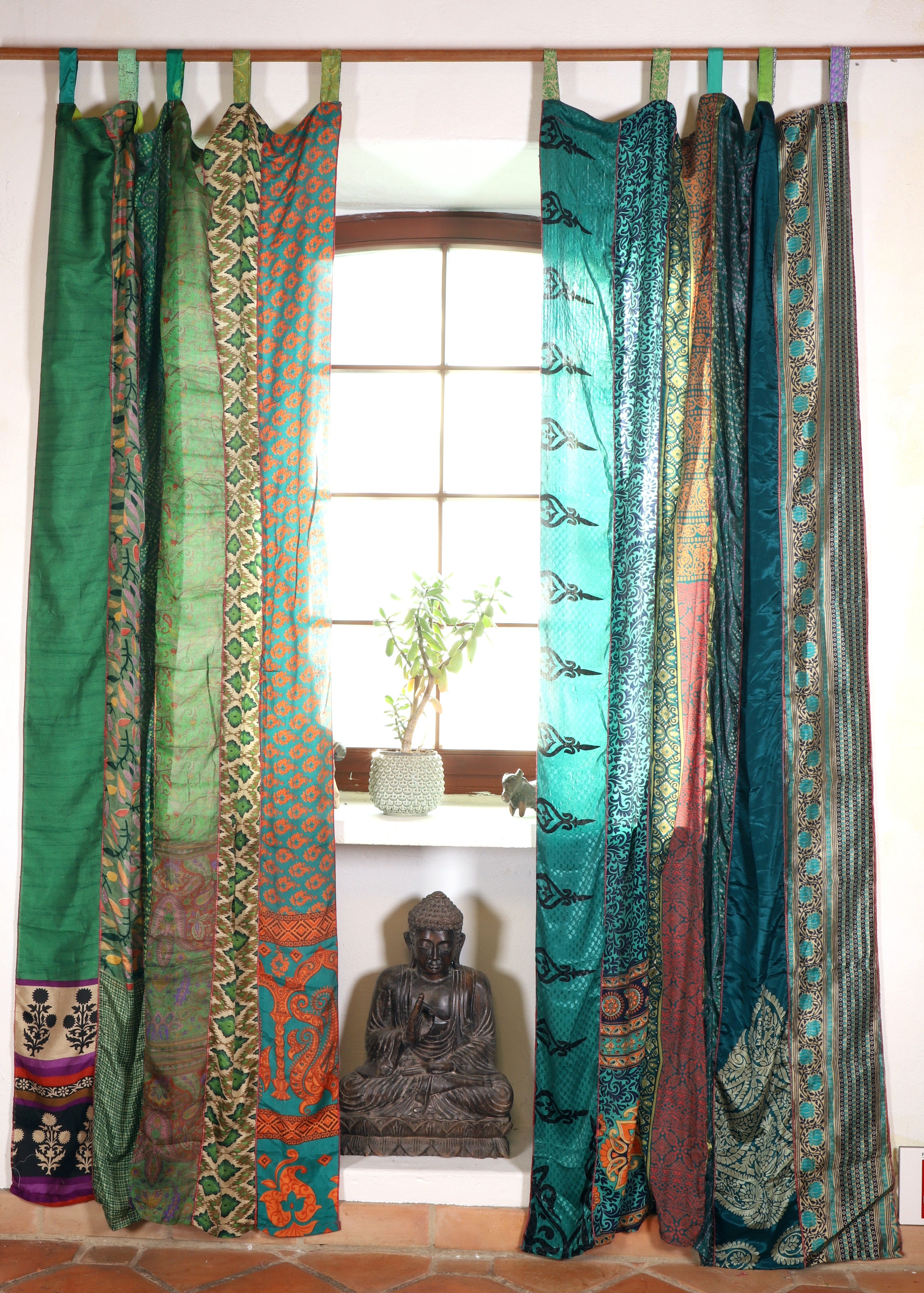 Einzigartiger Vorhang aus feinen, seidigen Sareestoffen mit Schlaufen. Jeder dieser Vorhänge entsteht aus upcycelt Saris, die in Indien gesammelt und in kunstvoller Handarbeit weiterverarbeitet werden. In vielen Regionen tauschen Frauen ihre getragenen Saris traditionell gegen Haushaltswaren oder Lebensmittel, eine alte Praxis, die diesen Stoffen ein zweites Leben verleiht. So wird aus traditioneller Kleidung ein einzigartiges Wohnaccessoire mit Geschichte. Dank seiner blickdichten, aber lichtdurchlässigen Eigenschaften entsteht bei Sonneneinfall ein zauberhaftes Farbspiel, perfekt für ein stilvolles und gemütliches Ambiente. Mit diesen farbenfrohen, blickdichten Vorhängen lässt sich im Handumdrehen eine gemütliche Boho-Atmosphäre zaubern. Perfekt fürs Fenster oder als Türvorhang lassen sich mit diesen orientalisch anmutenden Gardinenstores auch Himmelbetten und Sitzplätze wunderschön dekorieren. Bitte beachte: Da unsere Vorhänge aus verschiedenen (verschieden farbigen) Vintage Sarees hergestellt werden, ist jedes Exemplar ein Unikat und keines gleicht genau dem anderen (Dein Vorhang wird also von den Beispielbildern abweichen). Lieferumfang: 1 Vorhang