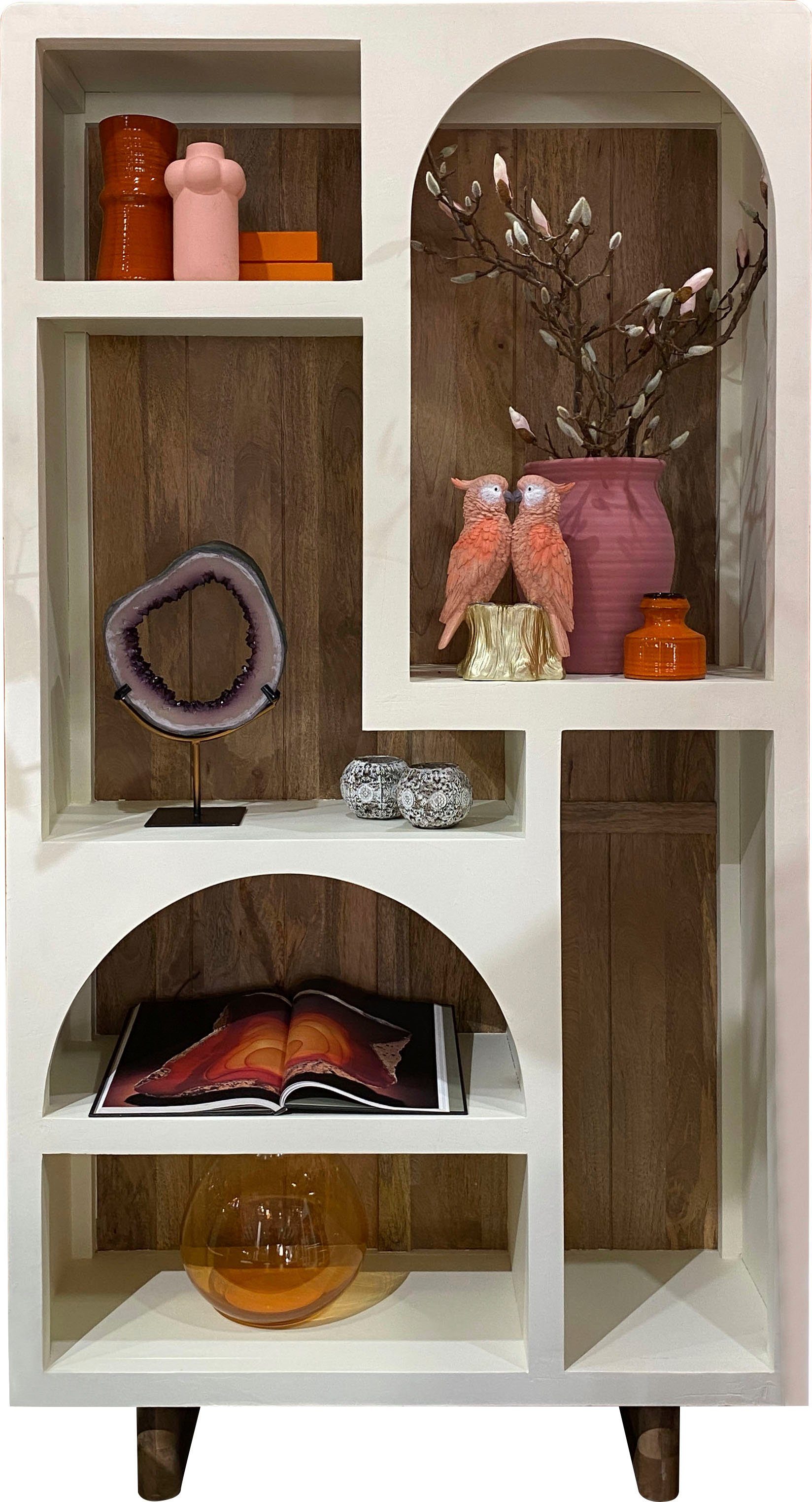 Rustikal und gemütlich zugleich — das Regalelement im Landhausstil lässt sich gut mit naturbelassenen Hölzern und natürlichen Stoffen wie Leinen, Baumwolle oder Flachs kombinieren. Dazu können beispielsweise Fundstücke vom Flohmarkt und Antiquitäten den rustikalen Look ergänzen.