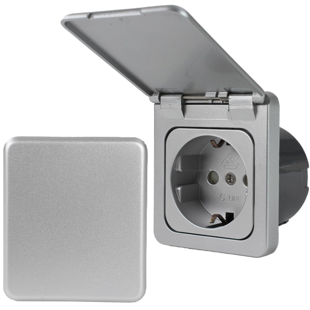 C-Line 230 Volt Schuko Steckdose mit Abdeckrahmen, Klappdeckel und Berührungsschutzdose in silber