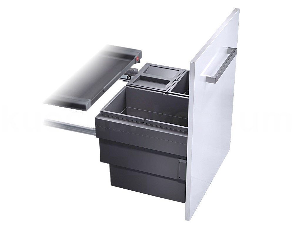 Für den 60 cm breiten Unterschrank in Ihrer Küche ist ein neues synchronisiertes Abfallsammlerauszug-System mit 3 Inneneimern und einem zusätzlich ausziehbaren Tablarboden erhältlich. Die Laufeigenschaft des Unterschrank Auszuges zeichnet sich besonders durch Stabilität, leisen und exaktem Gleichlauf aus. Die mit diesem Auszug herausfahrbaren Inneneimer besitzen zur sicheren Entnahme und dem Verklemmen von Müllbeuteln einen Doppelhenkel. Als zusätzliche Besonderheit deckt ein Auszug das gesamt Mülltrennsystem ab, auf dem durch die Antirutsch-Beschichtung darauf befindliches an Ort und Stelle verbleibt. Ein rundum gelungenes Müllsystem in ebenfalls neuer slate-grey Farbgebung.