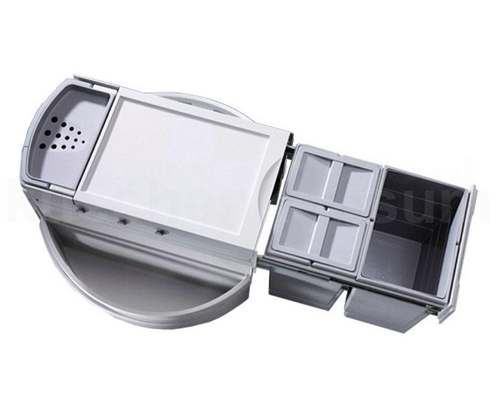 Nachdem der Hailo-Rondo Abfallsammler in einem 90 x 90 cm Eckunterschrank eingebaut wurde, ist dieser komplett um 360° drehbar. Das Abfallsystem verfügt über 3 Abfalleimer mit 1x 18 und 2x 8,5 Liter Volumen. Zudem ist der Müllentsorger mit einem multifunktionellem Behälter sowie zwei großzügigen Utensilienschalen ausgestattet. Zwei Biomülldeckel für einen die kleinen Eimer, ein Lochdeckel für den Mehrzweckeimer sowie ein großer Behälterdeckel, welcher als Ablage genutz werden kann, gehören ebenso zu dem Multifunktionssystem.