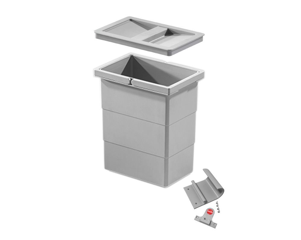 Um Verschiedenes zu verstauen oder aber den Abfall zu entsorgen, bietet sich dieses Eimer-Anbau-Set an. Es besteht aus einem 18 Liter fassenden Eimer inclusive Deckel. Mit Hilfe der Wandbefestigung kann der Eimer beliebig - an der Wand, im Möbel oder wo auch immer gewünscht - befestigt werden. Für die saubere Abfallentsorgung hält die Aufnahme, versteckt unter dem Kunststoffeimer, ein Vorratsfach für die Müllbeutelrolle bereit. Mit einem Handgriff ist der Hailo Eimer aus den Haltevorrichtung entnehmbar.
