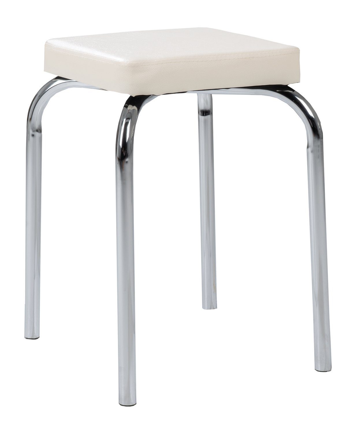 Zusätzliche Sitzplätze am Esstisch, oder als Sitzgelegenheit in einem anderen Raum, ein Hocker lässt sich vielseitig einsetzen. Und wenn Sie einen Stapelhocker suchen, der nicht nur praktisch, sondern auch noch stylisch ist, ist dieser bestimmt genau das Richtige für Sie. Die vier Beine sind aus Metall hergestellt und verchromt. Darauf befestigt ist das kleine, quadratische Polster, welches mit Kunstleder in weiß bezogen ist. Diese Kombination garantiert Ihnen, dass der Stapelhocker in jedes Ihrer Zimmer hineinpasst. Sie verwenden diesen Hocker als zusätzlichen Stuhl am Esszimmertisch, wenn mal Gäste da sind. Oder im Schlafzimmer, der Küche oder dem Flur wird eine Gelegenheit zum Sitzen benötigt, dann eignet sich ein kleiner, praktischer Stapelhocker perfekt.