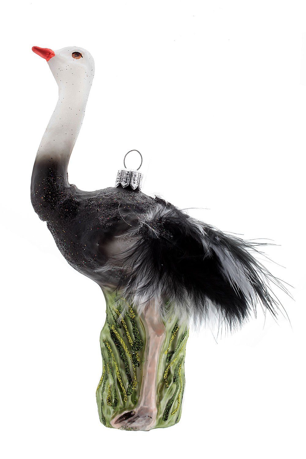 Die Christbaumfiguren der Strauße sind bis zu 13 Zentimeter hoch und haben ein Gewicht bis zu 35 gramm. Sie haben einen ovalen, horizontal ausgerichteten, schweren Rumpf und lange, unbefiederte Beine mit zwei nach vorn gerichteten, dicken Zehen an den Füßen. Der Kopf ist klein und unbefiedert, der Hals lang und nur minimal befiedert. Die Augen sind relativ groß; der Schnabel ist kurz, flach und breit. Als Standort am Weihnachtsbaum wird immer ein Ort gewählt, der dem Strauß einen guten Überblick über die Umgebung ermöglicht. Neuere Betrachtungen sehen diese Strauße nun als eigenständige Familie bei den Christbaumfiguren an.