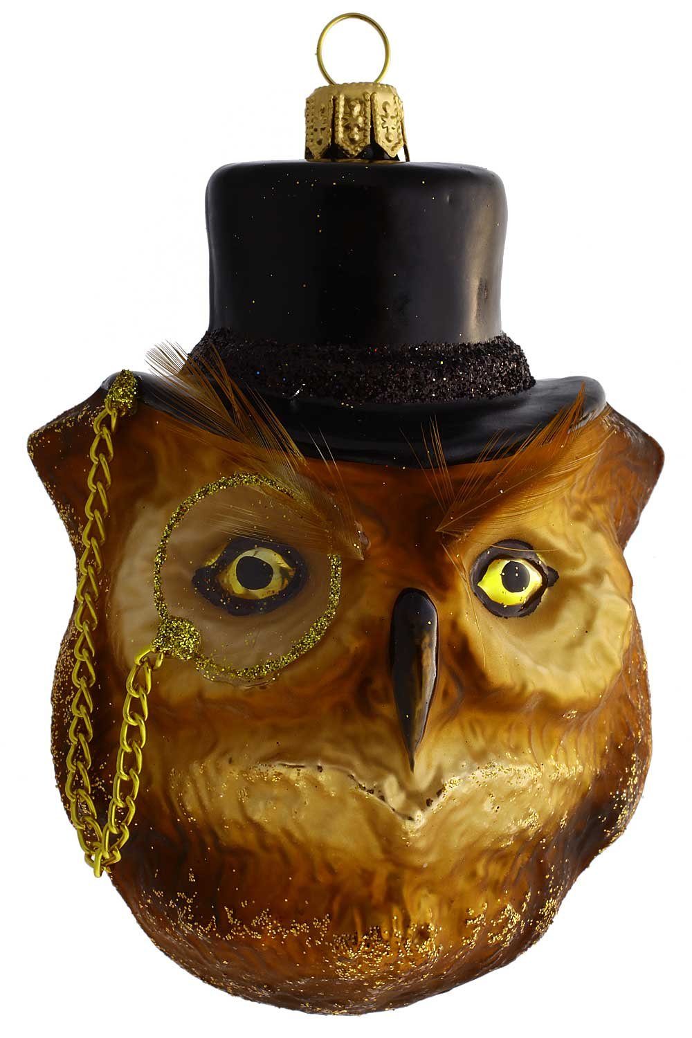 Die Natur ist unser Vorbild! Die Eule gilt in der westlichen Welt auch als Vogel der Weisheit; als solcher ist der Steinkauz. Zu diesem Ruf haben sicherlich der starre, ruhige Blick ihrer gelben Augen beigetragen. Glück soll es auch bringen, wenn sich eine Eule in den Christbaum befindet. Die Eulen mit ihren auffällig großen Augen, den wangenähnlichen Gesichtsflächen, dem an eine stark gebogene Nase erinnernden Schnabel und der aufrechten Haltung ist die Christbaumkugel ein Meisterwerk seiner Herstellung. Die frühesten nachgewiesenen Eulen stammen aus Lauscha, bei einer Zeitspanne von 40 Jahren.