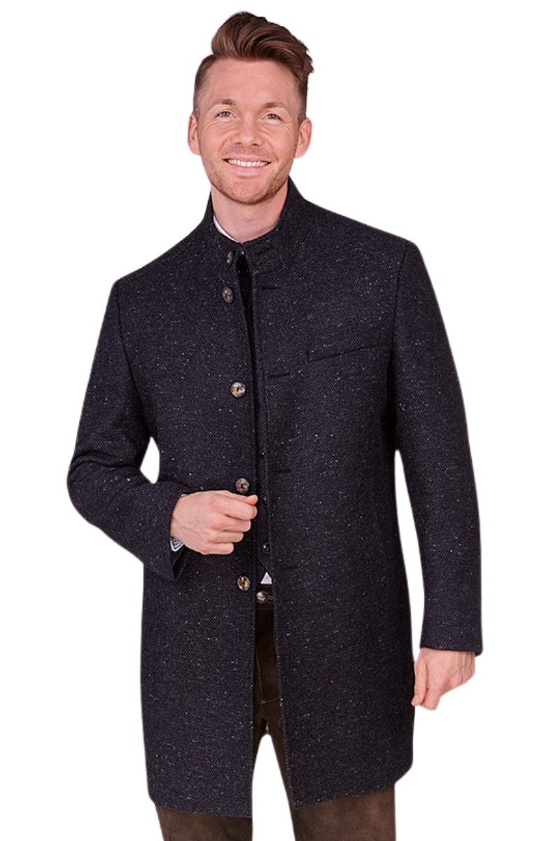 Dieser stilvolle, hochwertige Trachten Kurzmantel namens Philipp stammt von der Marke Hammerschmid und ein herrlicher Begleiter für Herren an kalten Tagen. Die Trachtenjacke in modischer Länge ist leicht tailliert geschnitten, mit viel weicher Wolle gearbeitet und hat ein kerniges Webmuster mit angenehmer Haptik und Melange-Akzenten. Den schönen, hohen Stehkragen ziert eine angedeutete Paspelkante und kann vorn per Knopf geschlossen werden. Sowohl die Knopf- als auch die Knopflochleiste und die Ärmelenden sind verstärkt und mit einer angedeuteten Paspelkante dezent betont. Die großen, rustikalen Knöpfe sind aus Horn-Material gefertigt und haben einen kernigen, unregelmäßigen Schliff. Links gibt es eine eingearbeitete Brusttasche mit breiter Paspel und beidseitig vorn Eingrifftaschen im Pattentaschen-Look mit schrägem Eingriff. Rückseitig mittig schmückt ein waagerechter Stoffbesatz als angedeuteter Rückenriegel den urigen Herrenmantel; unten ist er mittig überlappend geschlitzt. Komplett wird der Kurzmantel durch das glanzvolle Futter im feinen Streifen-Design und die Innentaschen links sowie rechts - beide als doppelte Paspeltaschen gestaltet, die linke zusätzlich mit Knopf. Der angesagte Mantel bietet einen tollen Tragekomfort und einen guten Wärmerückhalt.