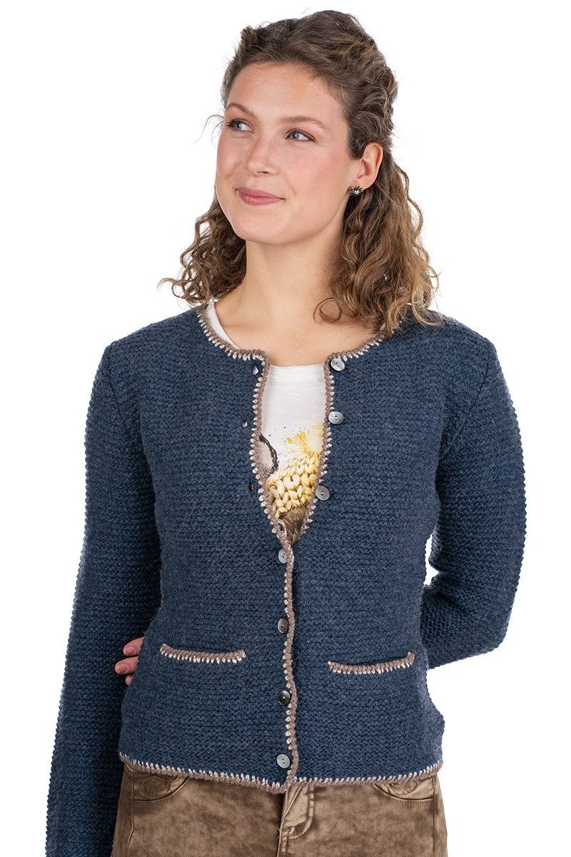 Tyrol, die kuschelige Damen Trachten Strickjacke in Rauchblau von der Marke Hammerschmid, wird mit viel flauschiger Wolle gefertigt und hat ein schickes Grobstrickmuster in Linksstrick-Art. Der Rundhals-Ausschnitt, die Eingriffe der Taschen, die Knopf- sowie Knopflochleiste, die Bündchen und der gerade Saum sind stilvoll im Kordel-Look in Nuss und Natur betont. Die Knopfleiste der hochwertigen, gemütlichen Damen Strickjacke schmücken wundervoll schillernde, echte Perlmuttknöpfe. Das Taschenfutter der Eingrifftaschen ist ebenfalls gestrickt und hat innen ein feineres Rechtsstrickmuster. Die herrliche Strickjacke für Damen lässt sich super zu Trachtenjeans und Lederhose kombinieren. Bitte beachten Sie ab Größe 48 die Größenzuschläge.