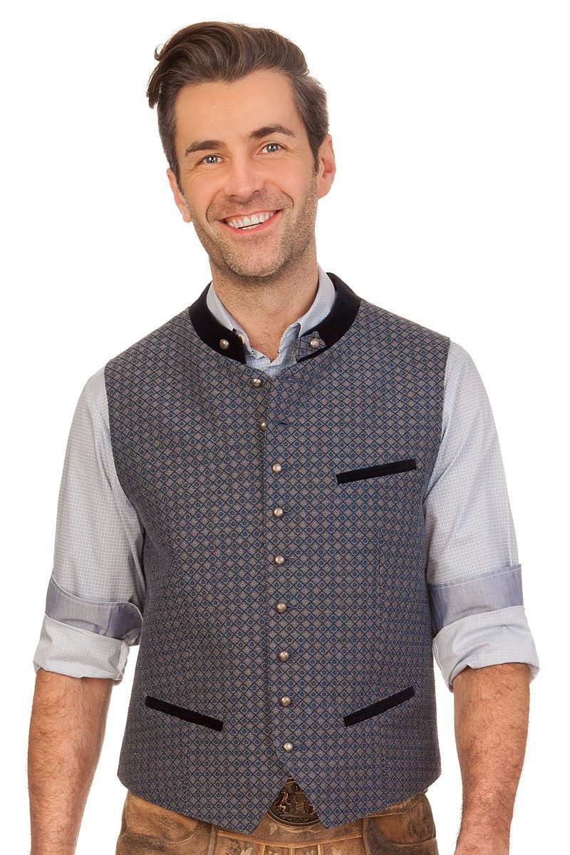 Die wundervolle Trachtenweste Mario zeigt sich anmutig mit Pfiff. Sie besteht vorn aus leicht schimmerndem Jacquard mit einem hübschen Blumen-Webmuster, hat einen traditionellen Stehkragen und der Westenrücken ist aus reiner Baumwolle gefertigt. Der Stehkragen aus edlem Samt hat außen einen Zierriegel aus Jacquard mit feinen, altsilbernen Kugelknöpfen und innen ein Jacquard-Futter. Die Knopfleiste ist ebenfalls mit kleinen, altsilbernen Kugelknöpfen im Antik-Stil bestückt. Die Brusttasche und beide Eingrifftaschen sind mit einer Samt-Paspel betont. Bei der blauen Variante sind die Samtakzente in Nachtblau gehalten; bei der grünen Variante im Komplementärkontrast (Dunkelrot). Der Rückenriegel mit der matt-silbernen Schnalle am schwarzen Westenrücken sorgt für einen perfekten Sitz. Die exquisite, sauber abgefütterte Herrenweste besitzt außerdem eine Innentasche. Die stilvolle Kreation aus dem Hause Hammerschmid ist ein festlicher Begleiter zur Lederhose und Trachtenjeans. Sie ist bis Größe 64 lieferbar - bitte beachten Sie den Übergrößenzuschlag ab Größe 58.