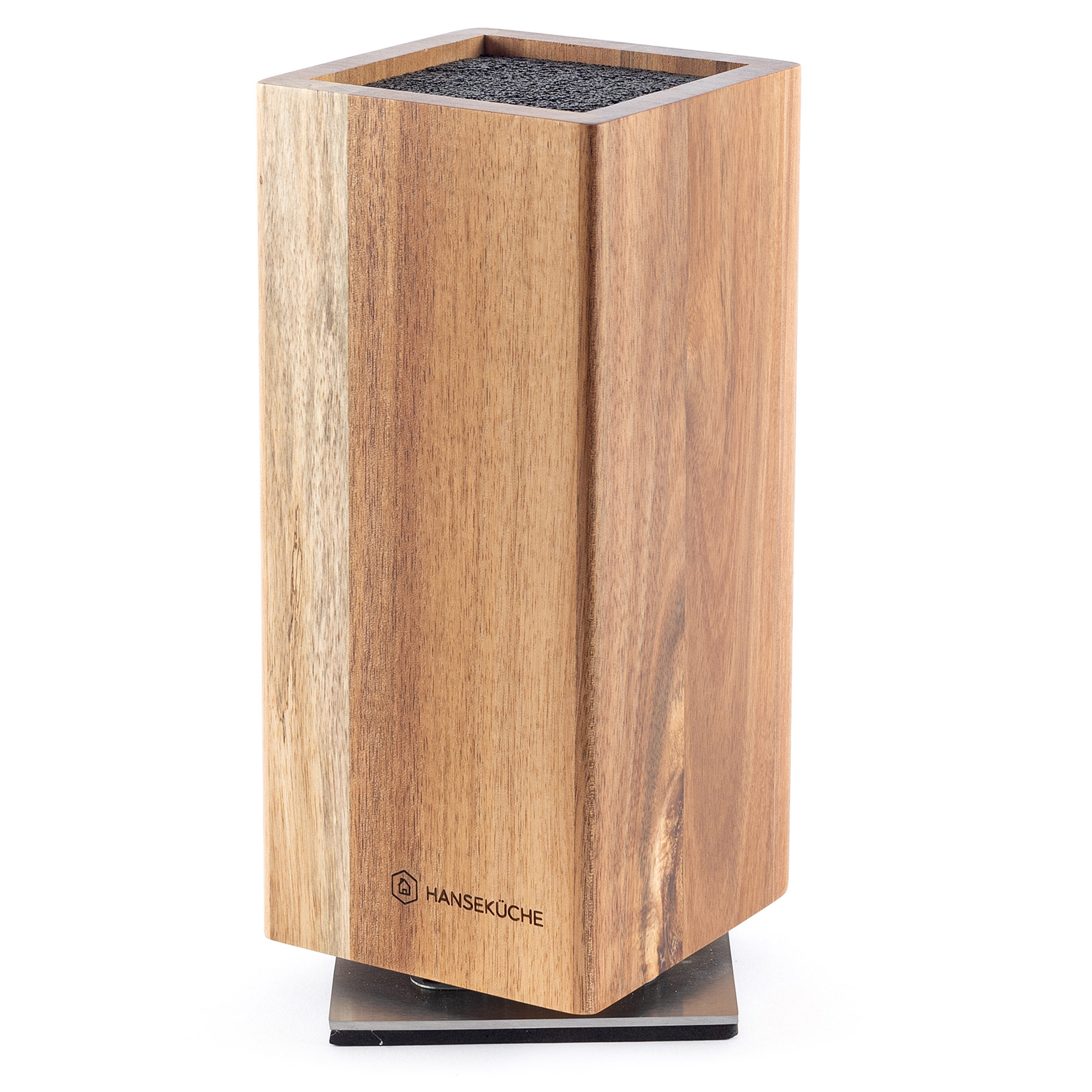Dieser hochwertige Messerblock vereint Funktionalität, Ästhetik und eine clevere Rotationsfunktion, die Ihre Kocherlebnisse noch angenehmer gestaltet. Hochwertiges Eichenholz - Natürliche Schönheit und Langlebigkeit: Der Hanseküche Messerblock wird aus hochwertigem Eichenholz gefertigt, das für seine natürliche Schönheit und Langlebigkeit bekannt ist. Die markante Maserung des Eichenholzes verleiht jedem Messerblock eine einzigartige Optik und macht ihn zu einem Blickfang in Ihrer Küche. Das robuste Eichenholz gewährleistet eine stabile und zuverlässige Aufbewahrung Ihrer wertvollen Küchenmesser. Magnetische Messeraufbewahrung - Sicher und griffbereit: Der Messerblock ist mit leistungsstarken Magneten ausgestattet, die Ihre Küchenmesser sicher und fest an Ort und Stelle halten. Die magnetische Aufbewahrung gewährleistet eine ordentliche Platzierung Ihrer Messer und verhindert, dass sie herumliegen und stumpf werden. Ihre Messer sind immer griffbereit und einsatzbereit, wenn Sie sie brauchen. Rotierende Funktion - Einfacher Zugriff auf Ihre Messer: Der Hanseküche Messerblock verfügt über eine praktische Rotationsfunktion, die Ihnen einen einfachen Zugriff auf Ihre Messer ermöglicht. Mit einem sanften Drehen des Blocks haben Sie alle Messer im Blick und können das benötigte Werkzeug schnell und mühelos auswählen. Die Rotation macht das Kochen und Zubereiten von Speisen noch effizienter und komfortabler. Platzsparendes Design - Ideal für kleine Küchen: Der rotierende magnetische Messerblock von Hanseküche ist besonders platzsparend gestaltet und eignet sich ideal für kleine Küchen. Dank seiner drehbaren Funktion benötigt er nur wenig Stellfläche und kann auf der Arbeitsplatte, in einem Küchenschrank oder in einer Ecke der Küche platziert werden. So haben Sie Ihre Messer immer griffbereit, ohne wertvollen Platz zu verschwenden. Schutz für Ihre Messerklingen - Sanft und schonend: Das Eichenholz des Messerblocks ist weich genug, um die Klingen Ihrer Messer zu schonen und gleichzeitig stark genug, um sie sicher zu halten. Die Messer werden sanft in das Holz eingebettet, sodass die Klingen vor Stößen und Beschädigungen geschützt sind. Dies verlängert die Lebensdauer Ihrer Messer und sorgt dafür, dass sie immer scharf und einsatzbereit sind. Vielseitige Messeraufbewahrung - Nicht nur für Küchenmesser: Der rotierende magnetische Messerblock von Hanseküche bietet nicht nur Platz für Küchenmesser, sondern kann auch für andere Messertypen verwendet werden. Sie können darin auch Steakmesser, Schälmesser oder Brotmesser sicher und griffbereit aufbewahren. Die vielseitige Aufbewahrungsmöglichkeit macht diesen Messerblock zu einem praktischen Accessoire für jede Küche. Einfache Reinigung und Pflege - Für eine langanhaltende Schönheit: Die glatte Oberfläche des Eichenholzes erleichtert die Reinigung des Messerblocks erheblich. Sie können Staub und Schmutz leicht abwischen und den Block gelegentlich mit Holzpflegeöl behandeln, um seine natürliche Schönheit zu bewahren. Die Pflege des Eichenholzes trägt dazu bei, dass der Messerblock lange Zeit seine Ästhetik und Funktionalität behält. Zeitloses Design - Eine ästhetische Bereicherung Ihrer Küche: Das zeitlose Design des Hanseküche Messerblocks aus Eichenholz passt perfekt zu verschiedenen Kücheneinrichtungen. Egal ob modern oder klassisch, der Messerblock verleiht Ihrer Küche eine natürliche und warme Note. Mit seiner hochwertigen Verarbeitung und edlen Optik wird dieser Messerblock zu einem stilvollen Blickfang in Ihrer Küche. Ideales Geschenk - Für Kochbegeisterte und Hobbyköche: Der rotierende magnetische Messerblock aus Eichenholz ist auch ein ideales Geschenk für Kochbegeisterte und Hobbyköche. Mit diesem hochwertigen und praktischen Küchenaccessoire verschenken Sie nicht nur eine clevere Aufbewahrungsmöglichkeit für Messer, sondern auch ein Stück Eleganz und Komfort in der Küche. Entdecken Sie die Vorzüge des Hanseküche rotierenden magnetischen Messerblocks aus Eichenholz und erleben Sie eine innovative und stilvolle Art der Messeraufbewahrung. Vertrauen Sie auf die Qualität und Expertise von Hanseküche und bereichern Sie Ihre Küche mit diesem hochwertigen und funktionalen Messerblock. Hanseküche - für Küchenzubehör, das Ihre Kocherlebnisse bereichert.