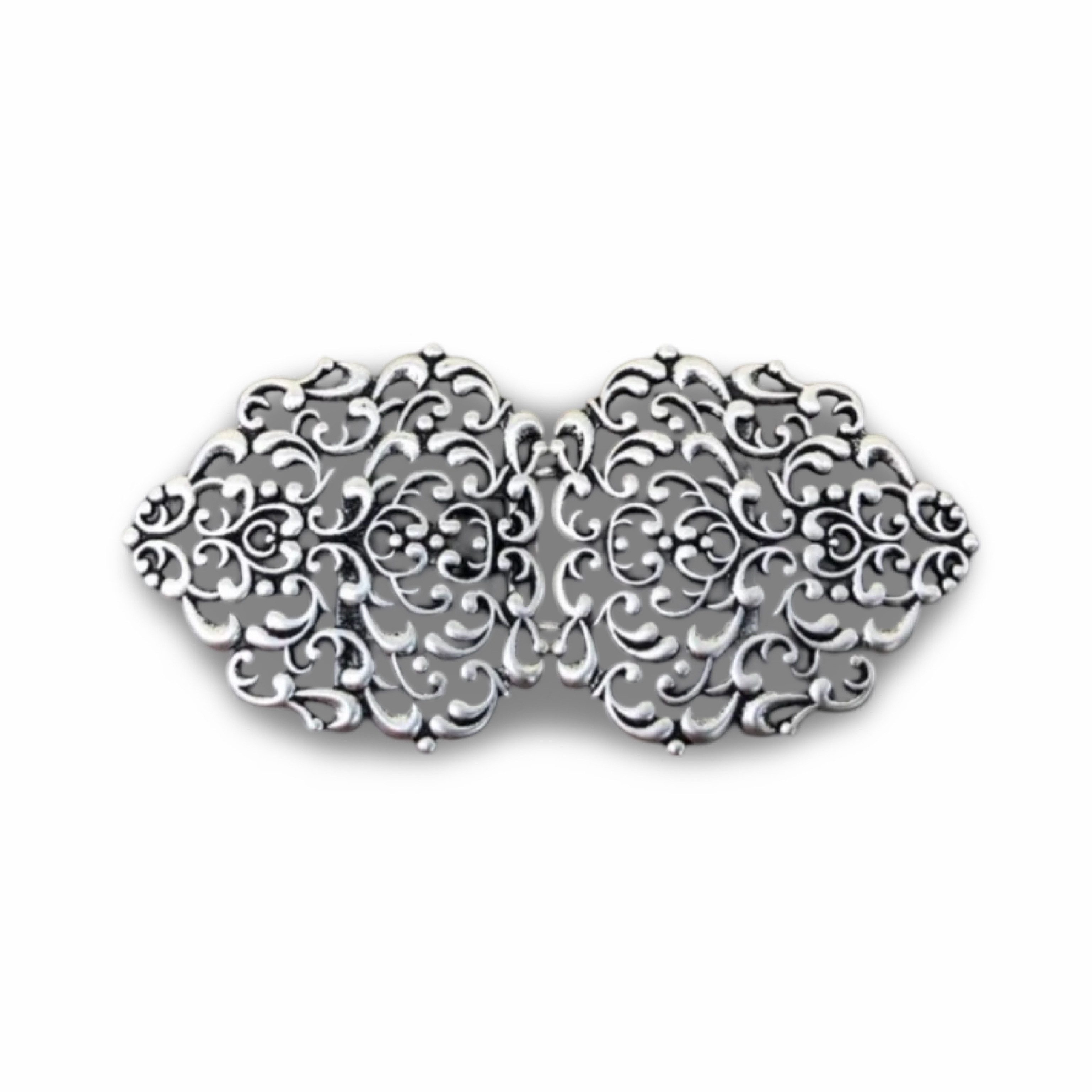 schöne und filligrane Trachtenschliesse / Schürzenschliesse, helles silber antik, eher matt, zum Annähen an leichte Bänder besonders edle Farbgebung, helles altsilber, eher matt zartes Design, zum Einhaken, Stegbreite 30mm (Schürzenband Breite 3cm) Größe ca.70mmx35mm, leichtes Gewicht Lieferumfang: 1 Stück Bitte prüfen Sie IHRE benötigte Größe!