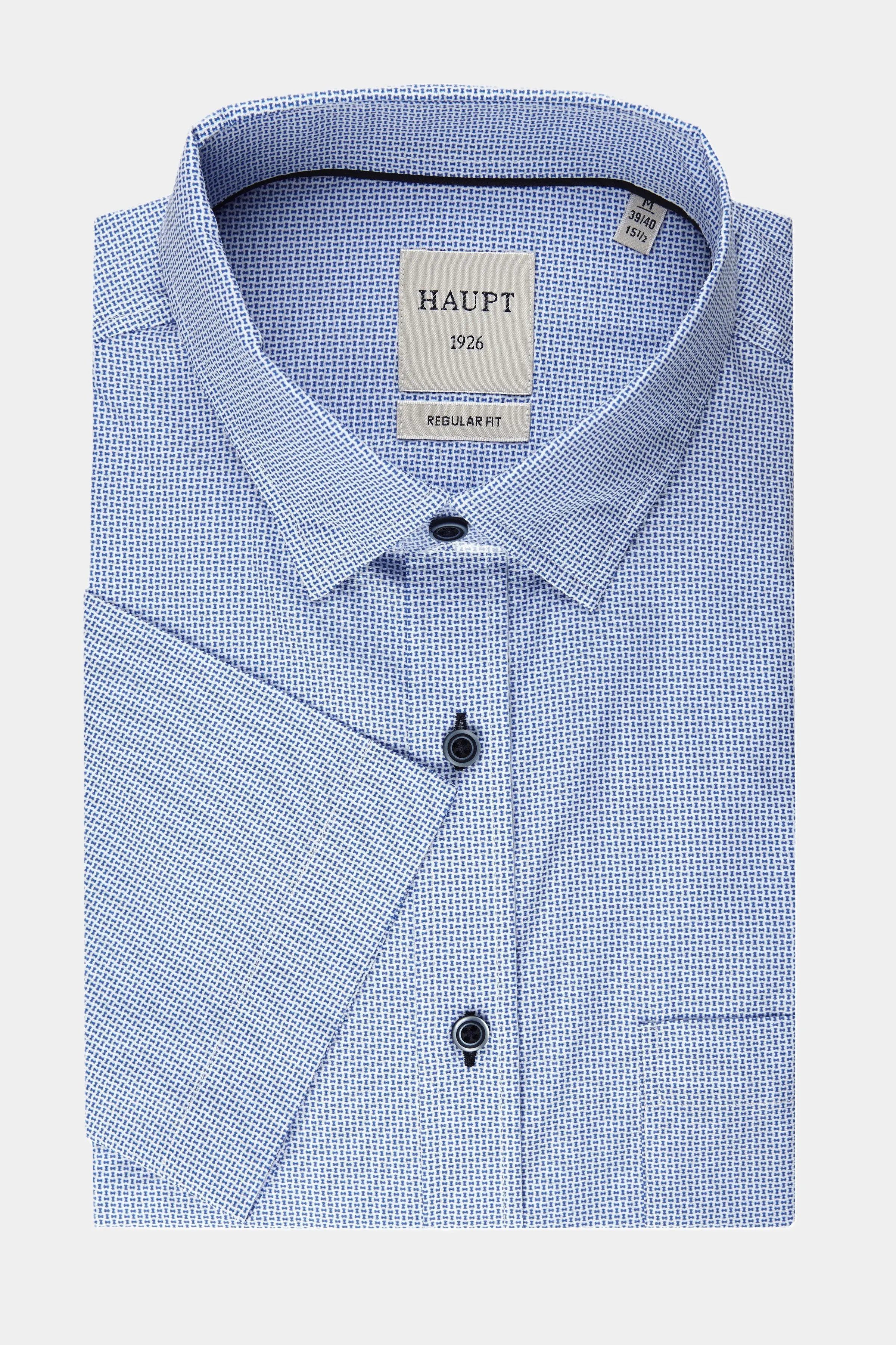 Dieses Kurzarmhemd der Marke Haupt ist ein zeitloser Klassiker. Es präsentiert sich in einem klaren, hellblauen Farbton mit einem feinen, flächendeckenden Mikro-Jacquard-Muster, das auf der Haut wie ein leicht strukturiertes Hellblau wirkt. Der bequeme Regular Fit bietet eine komfortable, gerade Passform. Die dunklen, kontrastierenden Knöpfe setzen einen eleganten Akzent zum hellen Stoff. Ausgestattet mit einem Kent-Kragen und einer dezenten Brusttasche, ist dieses Hemd der ideale Partner für den Business-Casual-Bereich oder smarte Freizeit-Looks an warmen Tagen.