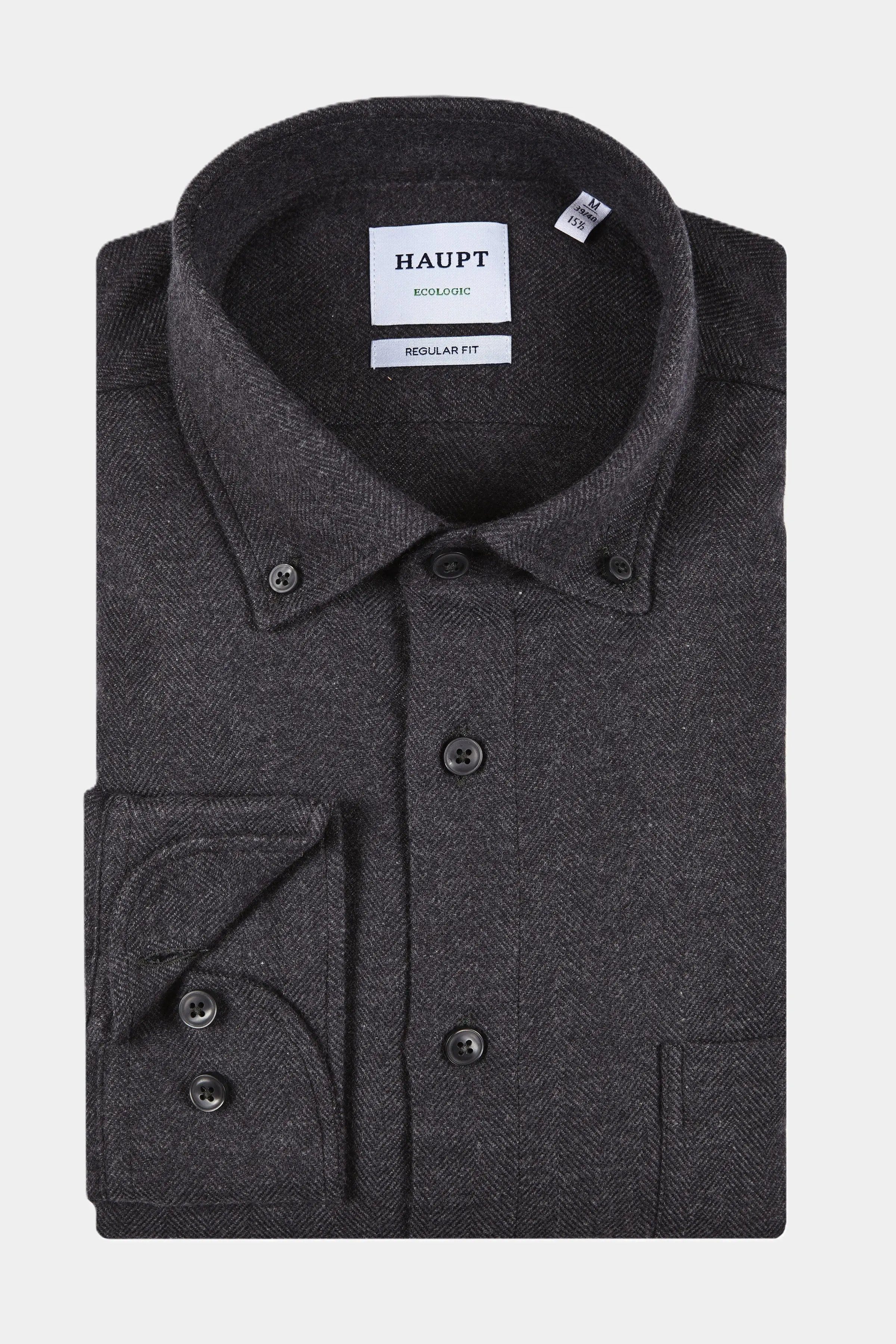 Dieses hochwertige Langarmhemd der Marke Haupt überzeugt durch seine warme Haptik und den zeitlosen Stil. Der Stoff ist in einem dunklen Anthrazitgrau gehalten und weist ein feines, strukturiertes Fischgrät-Muster (Chevron) auf, das dem Hemd eine elegante Tiefe verleiht.