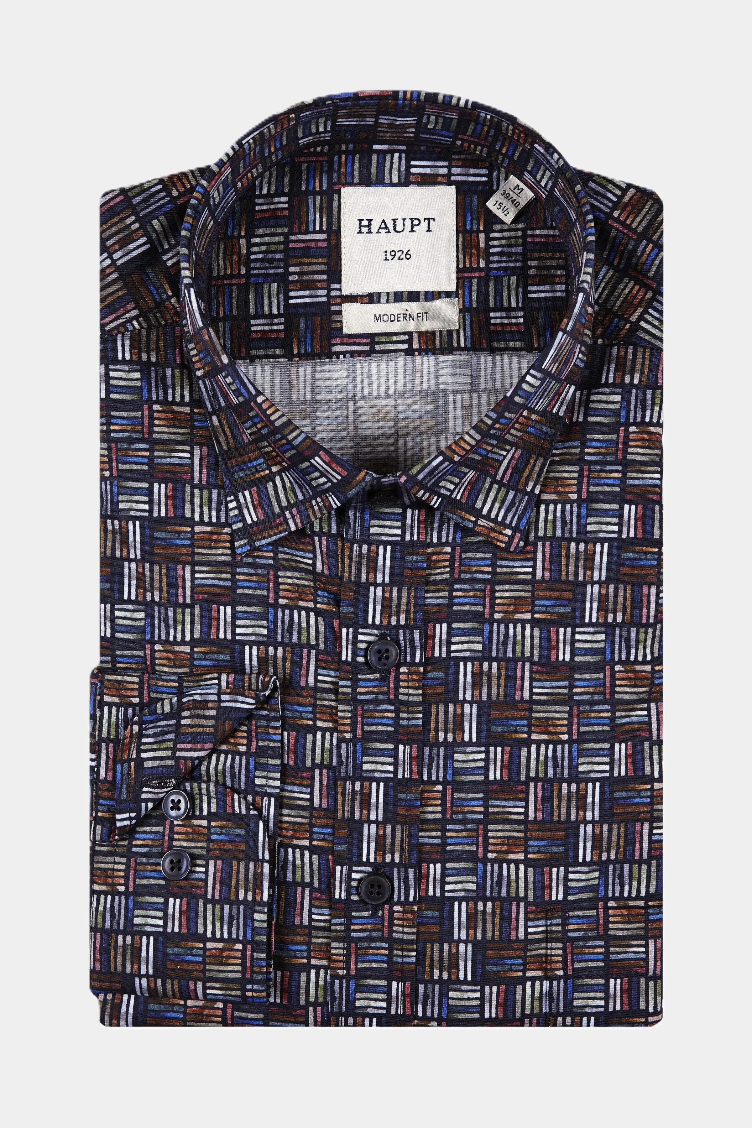 Mit diesem Hemd der Marke Haupt in der Modern Fit Passform setzen Sie ein souveränes Fashion-Statement. Es besticht durch ein faszinierendes, grafisches All-Over-Muster, das an ein abstraktes Mosaik oder eine beleuchtete Skyline bei Nacht erinnert. Die Basis bildet ein tiefes Marineblau oder Schwarz, das die leuchtenden Farben des Musters besonders hervorhebt.