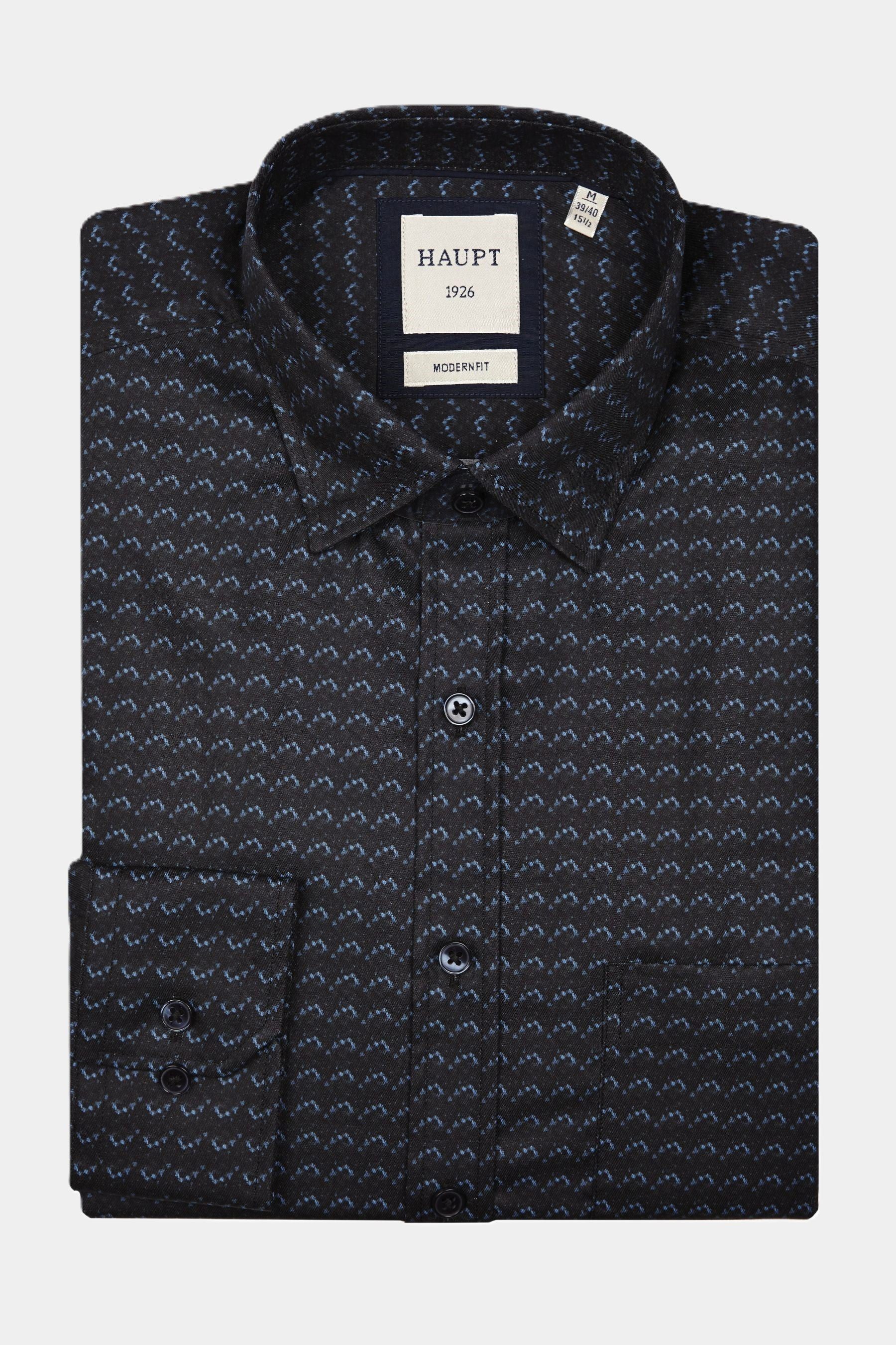 Mit diesem Hemd der Marke Haupt beweisen Sie Stil und Understatement. Die dunkle Grundfarbe – ein sehr tiefes Marineblau, das fast schwarz wirkt – bildet die ideale Bühne für das feine, wiederkehrende Zickzack- oder Chevron-Mikromuster. Dieses Muster, ausgeführt in einem gedämpften Hellblau oder Hellgrau, verleiht dem Stoff eine lebendige Textur und verhindert, dass das Hemd zu schlicht erscheint.