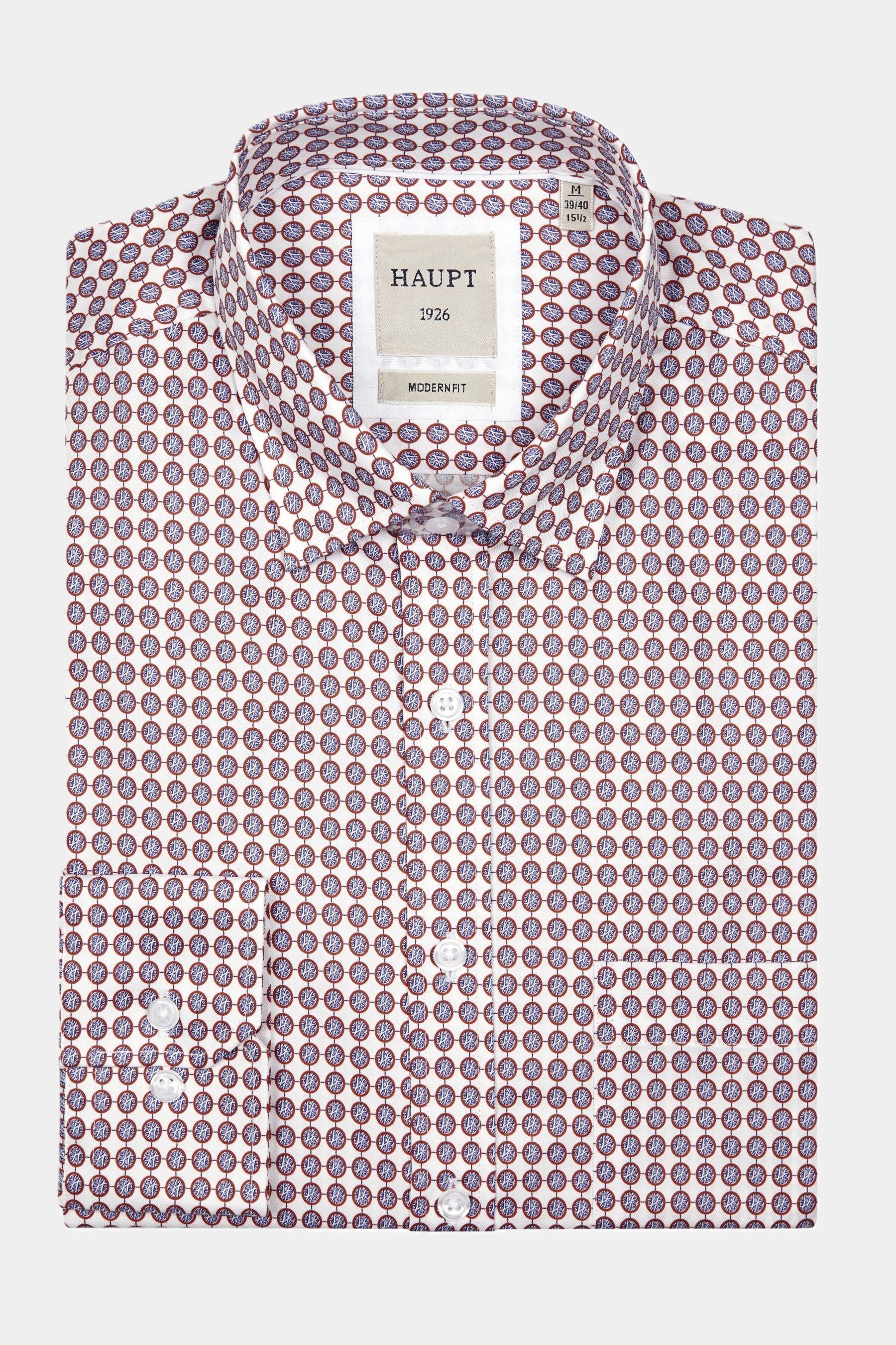 Dieses Langarmhemd der Marke Haupt in der Passform Modern Fit ist ein Highlight für Liebhaber subtiler Details. Das Hemd basiert auf einem sauberen, weißen Grund und wird von einem dichten, geometrischen Medaillon- oder Kettenmuster in sanften Farbtönen überzogen. Die kleinen Kreise werden von einem Rahmen in dunklem Bordeaux-Rot umschlossen, während der Kern durch ein dezentes Hellblau-Violett akzentuiert wird.