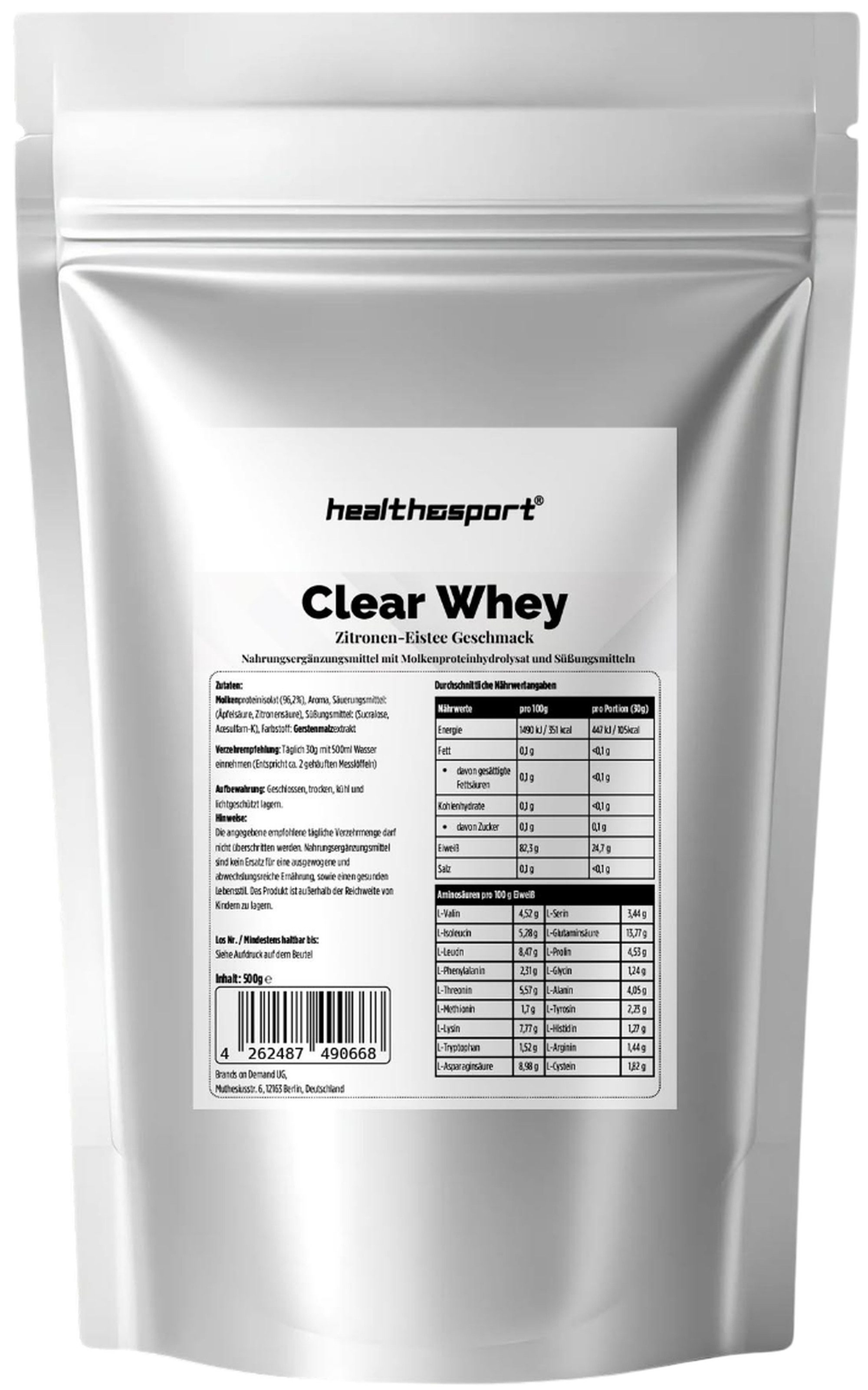 | Bezeichnung des Nahrungsergänzungsmittels | Health & Sport Clear Whey Protein Eistee Zitrone - 500g |