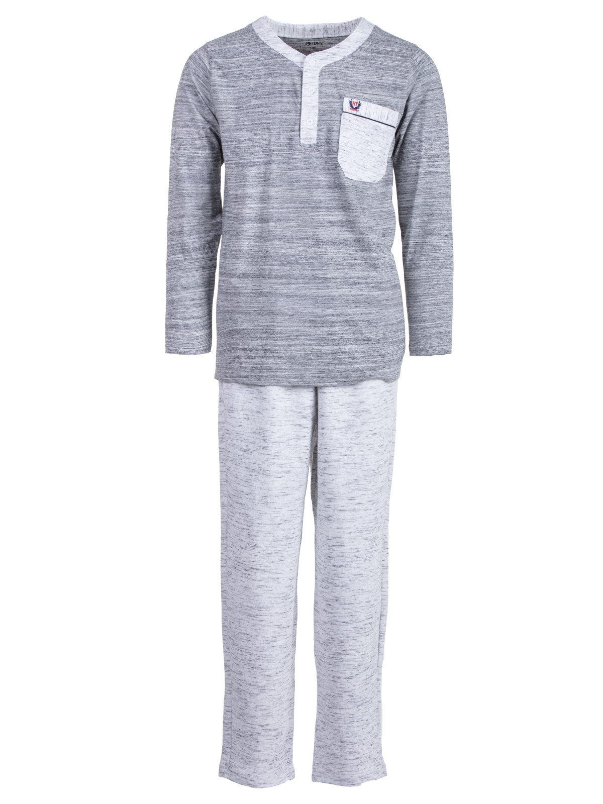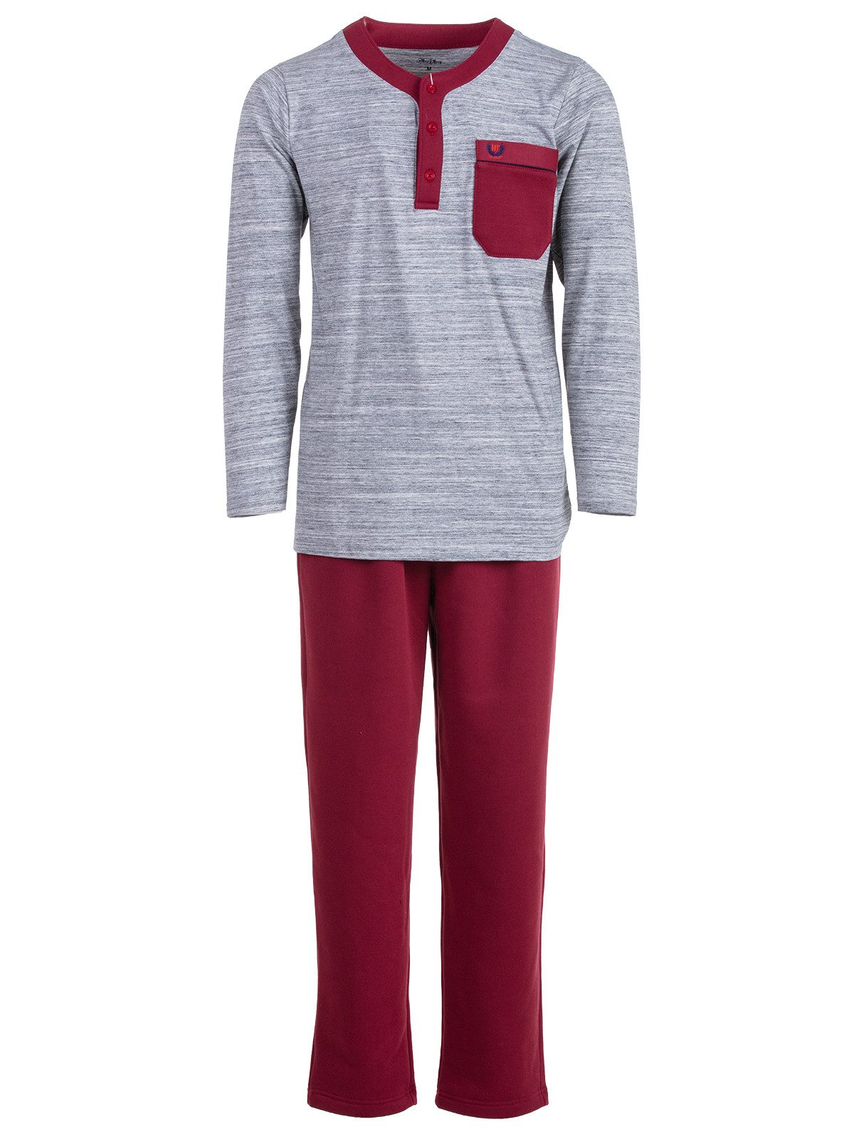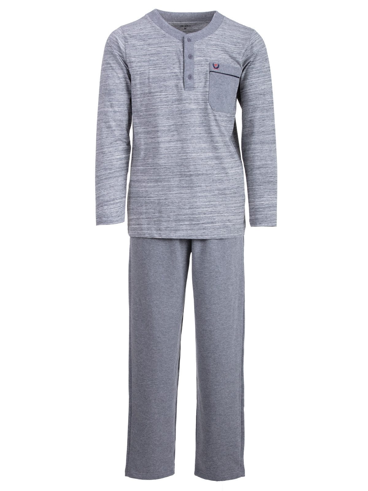 Der Herren- Hausanzug hat ein modisches und zeitloses Design und ist angenehm auf der Haut zu tragen. Mit Rundhalsausschnitt und farblich zur Hose passende Knopfleiste. Die lange Hose hat einen Dehnbund.