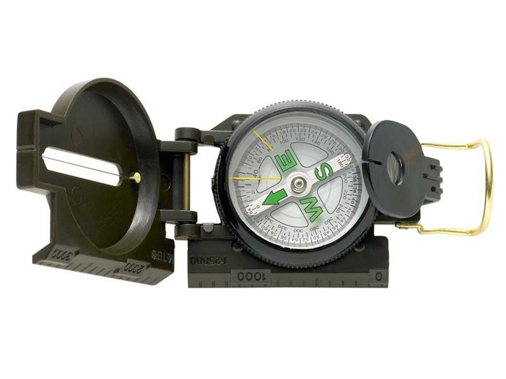 Ein zuverlässiger Kompass, untergebracht in einem dunkelgrünen Kunststoffgehäuse. Im Deckel befindet sich ein Visierschlitz zum Anpeilen. Zur Ausstattung gehören außerdem eine Anlegekante mit Maßstabeinteilung 1:25000, ein Vergrößerungsglas im Sucher und eine drehbare Skala. Alle wichtigen Punkte sind mit Leuchtfarbe belegt. Mit kombinierter Teilung 360 Grad/64 Strich.