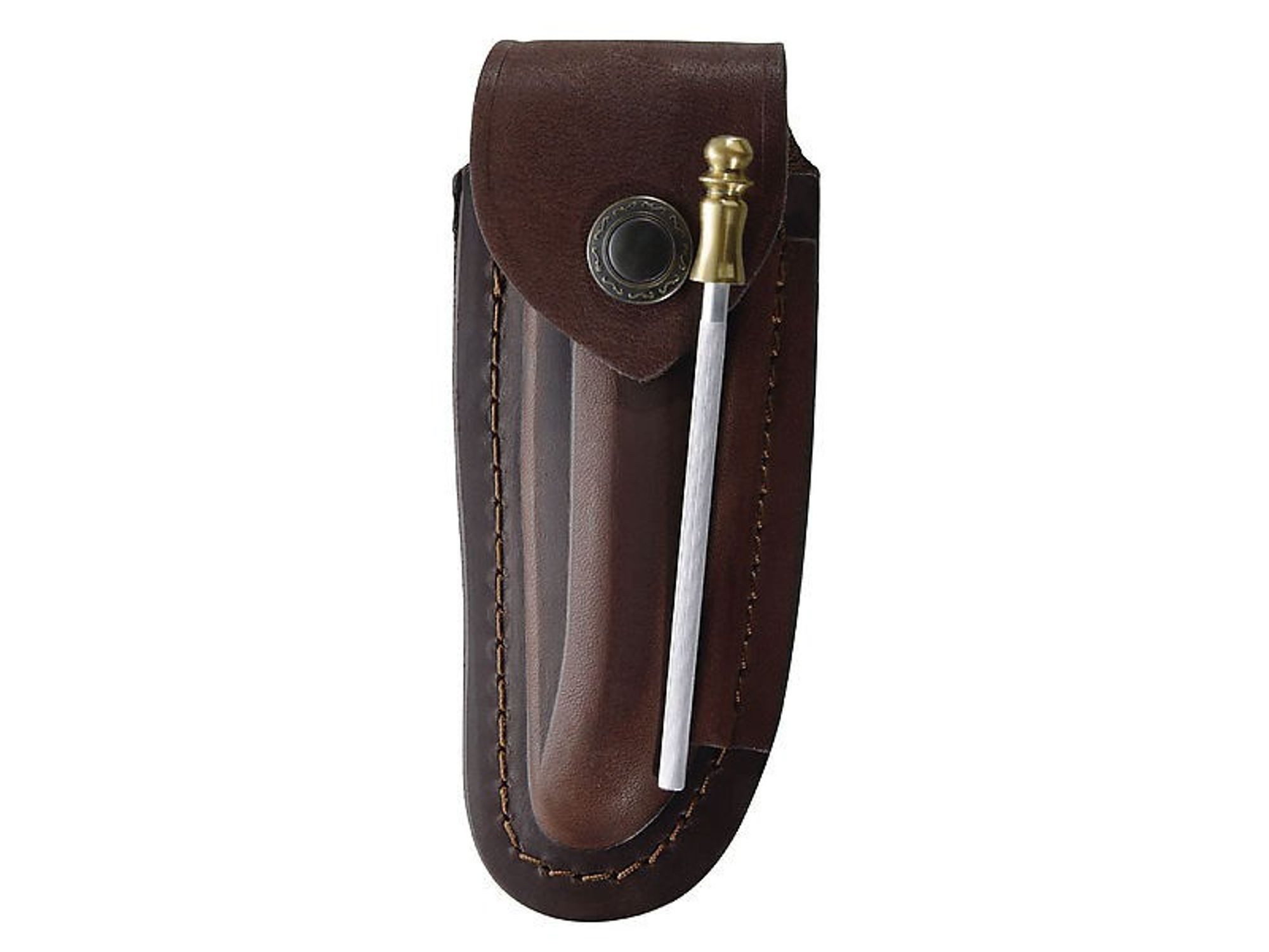 Eigens für Laguiole Messer mit einer Heftlänge von 12 cm ist dieses braune Lederetui vorgesehen. Mit der Gürtelschlaufe kann es wahlweise längs oder quer getragen werden. Ein 10 cm langer Wetzstahl ist inklusive.