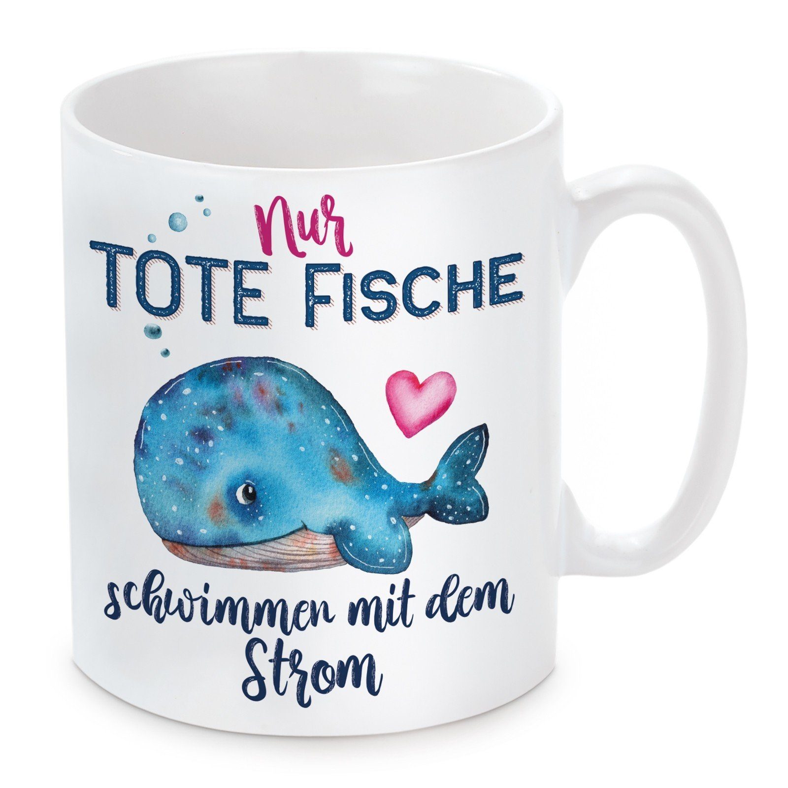 Herzbotschaft Tasse Kaffeebecher mit Motiv Nur tote Fische schwimmen mit dem Strom, Keramik, Kaffeetasse spülmaschinenfest und mikrowellengeeignet