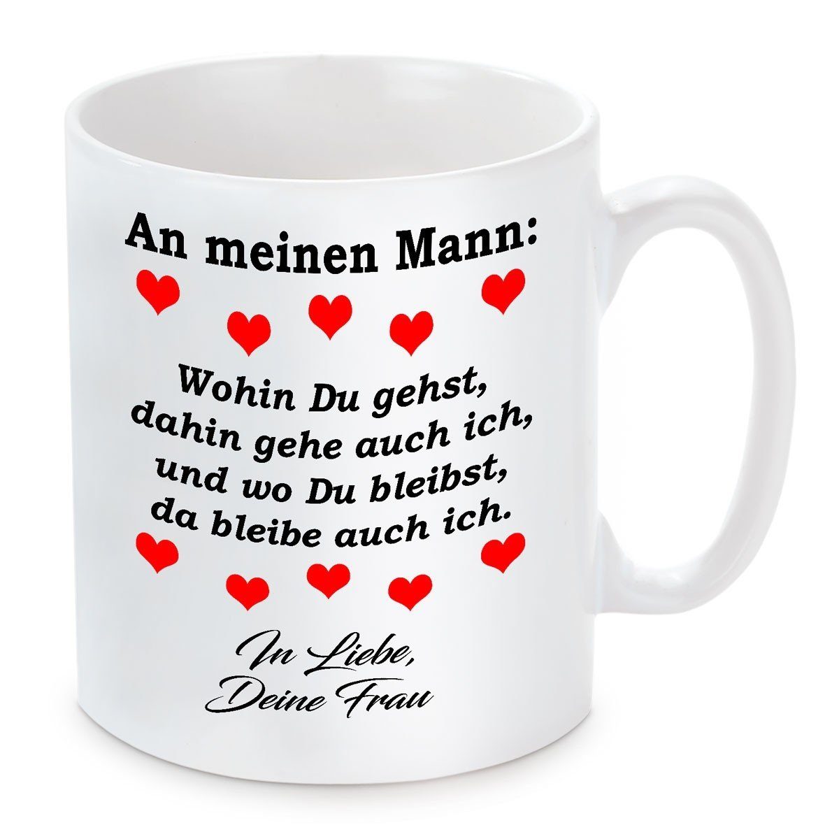Herzbotschaft Tasse Kaffeebecher mit Motiv Wohin du gehst dahin gehe auch ich Mann, Keramik, Kaffeetasse spülmaschinenfest und mikrowellengeeignet
