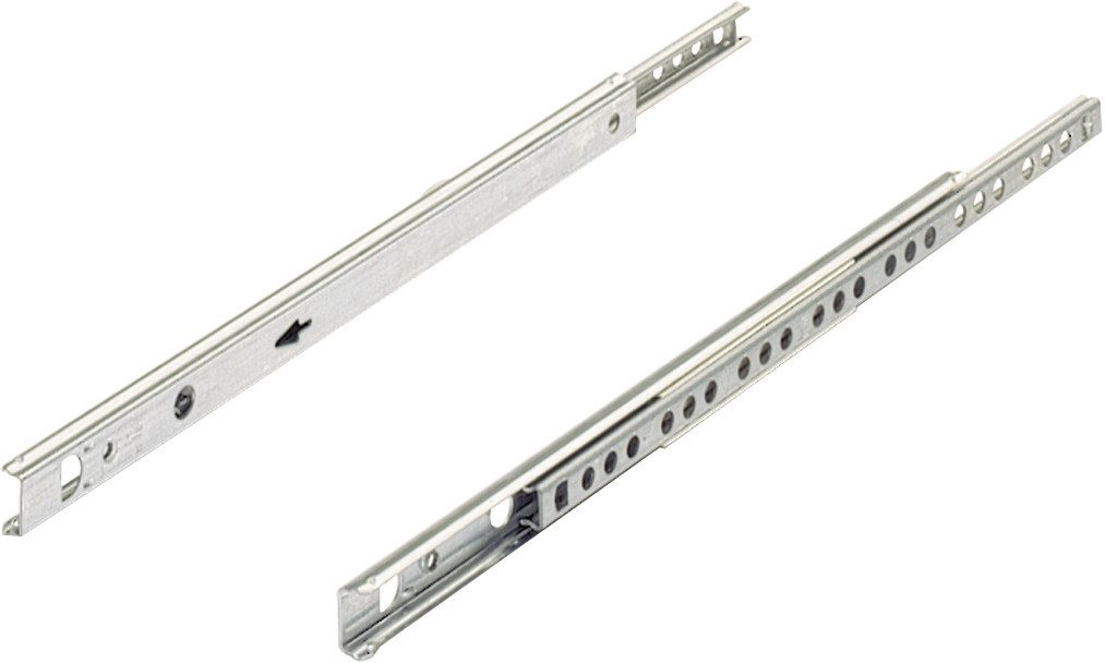 Produktdetails: Min. Schubkastenlänge: 550 mm | Max. Schubkastenlänge: 550 mm | Lochabstand: 288 mm | Inhalt: 2 Stück | Mindestkorpustiefe: 550 mm | Nutbreite: 17 mm | Auszugsart: Teilauszug, Kugelauszug | Auszugsverlust: 100 mm | Montage: seitliche Montage | Geeignet für: Holzschubkästen mit genutetem, gefälztem oder aufgesetztem Boden | Belastbarkeit: 10 kg | Material: Stahl | Oberfläche: verzinkt | Zusatzinformationen: Auszugsanschlag, Ausrollsicherung, Führungsschiene und Kugelkäfig bilden eine komplette nicht trennbare Einheit, Leichter Lauf und hohe Seitenstabilität durch exakte Führung, Pfeil zur Kennzeichnung der Einbaurichtung, Inkl. Montageschrauben |