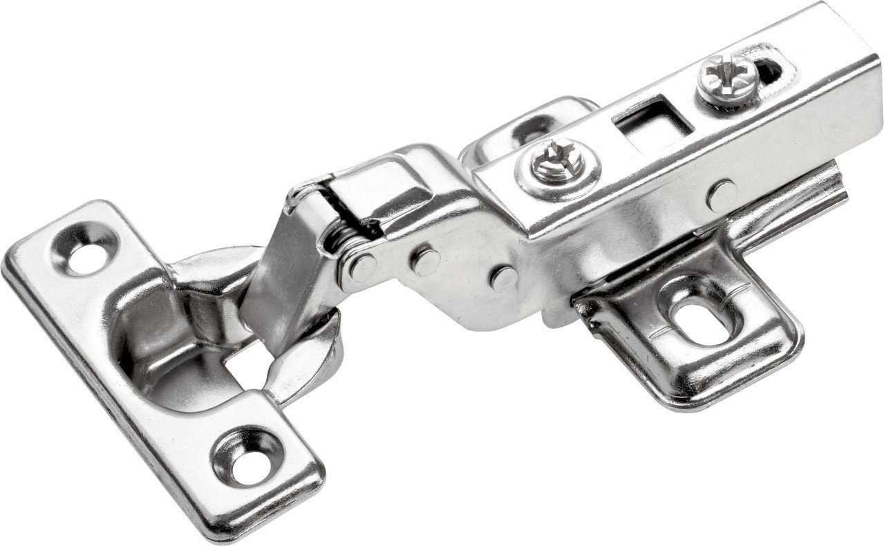 Automatikscharnier mit Aufklipsmontage und integrierter Dämpfung Öffnungswinkel110° Topfdurchmesser 26 mm Mit Kreuzmontageplatte Scharniertopf / -arm: Stahl, vernickelt