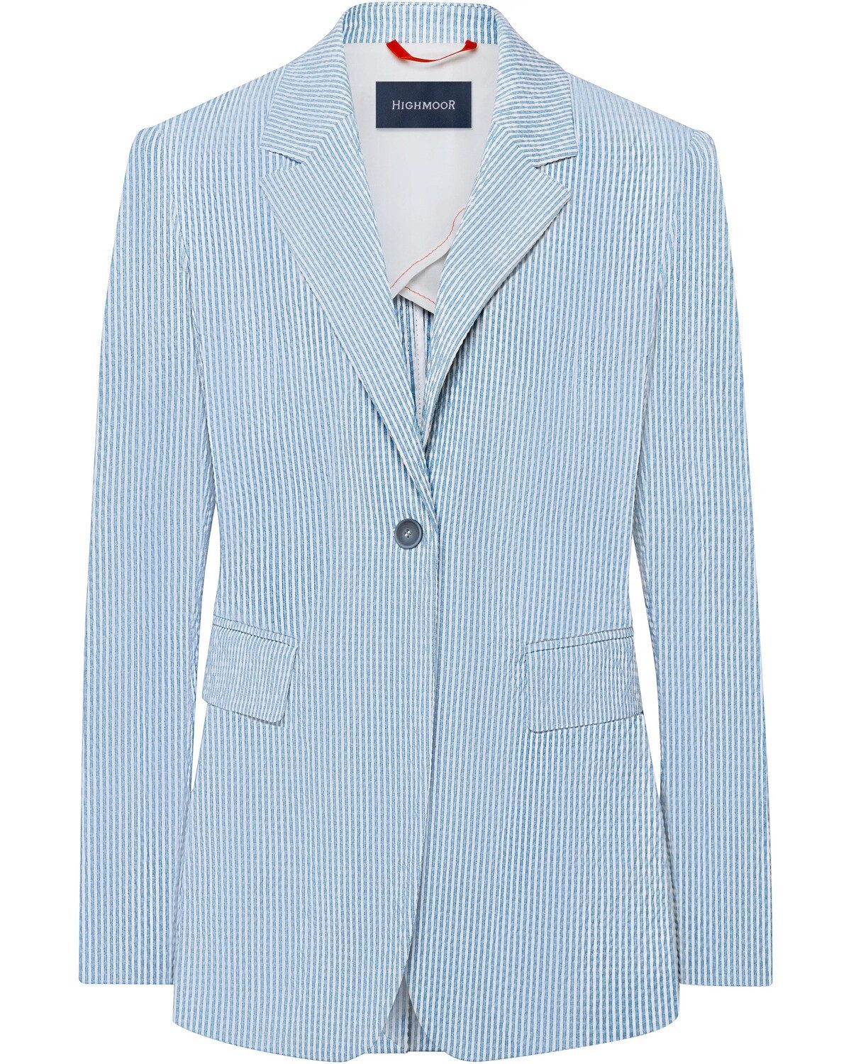 Der Damen Blazer von Highmoor bringt mit seinem sommerlichen Streifendesign in Bleu-Weiß frische Eleganz in jede Garderobe. Der klassische Reverskragen unterstreicht den zeitlosen Stil, während die Ein-Knopf-Frontleiste einen modernen Akzent setzt. Die Pattentaschen fügen eine praktische und stilvolle Note hinzu. Der Blazer verfügt über einen mittigen Rückenschlitz, der für Bewegungsfreiheit und eine schmeichelhafte Passform sorgt. Teilgefüttert im Schulterbereich und den Ärmeln, bietet er leichten Tragekomfort und bleibt dabei angenehm luftig – perfekt für warme Tage. Mit einer Rückenlänge von ca. 70 cm passt der Blazer ideal zu verschiedenen Outfits. Ob zu Jeans für einen lässigen Look oder zu einer eleganten Hose für formelle Anlässe, dieser Blazer ist vielseitig einsetzbar und verleiht jedem Outfit eine elegante Note. Perfekt für stilbewusste Frauen, die Qualität und Design schätzen. Oberstoff: 48% Polyester, 26% Viskose, 25% Baumwolle, 1% Elasthan; Futter: 100% Viskose