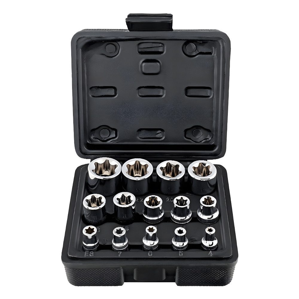 2. 14-teiliges Set: 5 x 1/4„-Steckschlüsseleinsätze E4, E5, E6, E7, E8; 5 x 3/8“-Steckschlüsseleinsätze E10, E11, E12, E14, E16; 4 x 1/2"-Steckschlüsseleinsätze E18, E20, E22, E24.