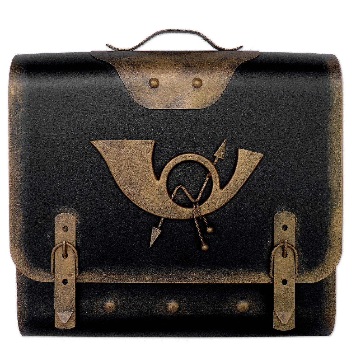 Wunderschöner robuster Briefkasten im Design Alten Schulranzen mit Posthorn, hergestellt mit viel Liebe zum Detail und hochwertigen Materialien.
