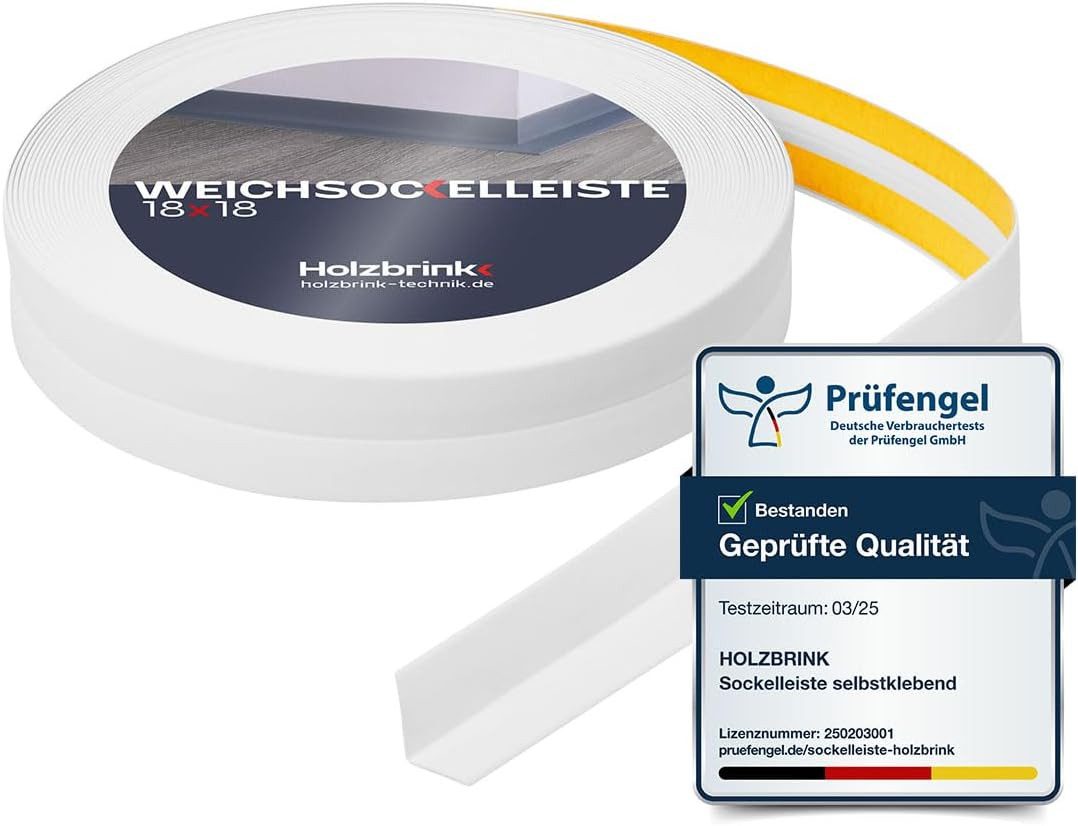 Suchen Sie nach einer einfachen und ästhetischen Lösung für den perfekten Abschluss Ihrer Innenräume? Die Weichsockelleiste selbstklebend von Holzbrink ist eine funktionale Wahl, um Fugen, Unebenheiten und Übergänge zwischen Wand und Boden, an Arbeitsplatten, Fenstern oder in Ecken effektiv zu kaschieren. Hergestellt aus flexiblem PVC, passt sie sich jeder Oberfläche an, ohne sich zu verformen. Dank ihrer Widerstandsfähigkeit gegen Feuchtigkeit, Schimmel, Pilze und Chemikalien eignet sie sich nicht nur für Wohn- und Schlafzimmer, sondern auch für Küchen, Bäder und Gewerberäume. Die selbstklebende Variante ist mit zwei starken Acrylklebestreifen ausgestattet, die eine dauerhafte und sichere Befestigung auf Fliesen, Paneelen, glatten Wänden und Arbeitsplatten gewährleisten. Kein zusätzliches Kleben oder Bohren erforderlich – einfach die Schutzfolie abziehen und die Weichsockelleiste selbstklebend an die Oberfläche andrücken. Wenn Sie eine alternative Befestigungsmethode bevorzugen, ist das Modell auch ohne Klebestreifen erhältlich. Erhältlich in 11 Farben – darunter Weiß, Schwarz, Schokoladenbraun, Cappuccino, Aschgrau, Dunkelgrau, Hellgrau, Eiche hell, Eiche dunkel, Kiefer und Birke – lässt sich die Leiste problemlos an Ihre Raumgestaltung anpassen. Die verfügbaren Größen sind 18x18 mm, 32x23 mm, 50x20 mm, 70x20 mm und 100x25 mm, wobei die beiden letzten Varianten auch ohne Klebestreifen angeboten werden. Zudem können Sie zwischen Längen von 5 bis 25 Metern wählen, um die perfekte Passform für Ihr Projekt zu finden. Die Montage ist schnell und intuitiv – einfach mit einer Schere oder einem Cuttermesser auf die gewünschte Länge zuschneiden. Die Weichsockelleiste selbstklebend ist ideal für Wohnzimmer und Schlafzimmer, um Übergänge zwischen Wand und Boden zu kaschieren, für Küchen und Bäder zum Schutz von Fugen zwischen Arbeitsplatte und Wand sowie für Ecken, Fenster und Türen.