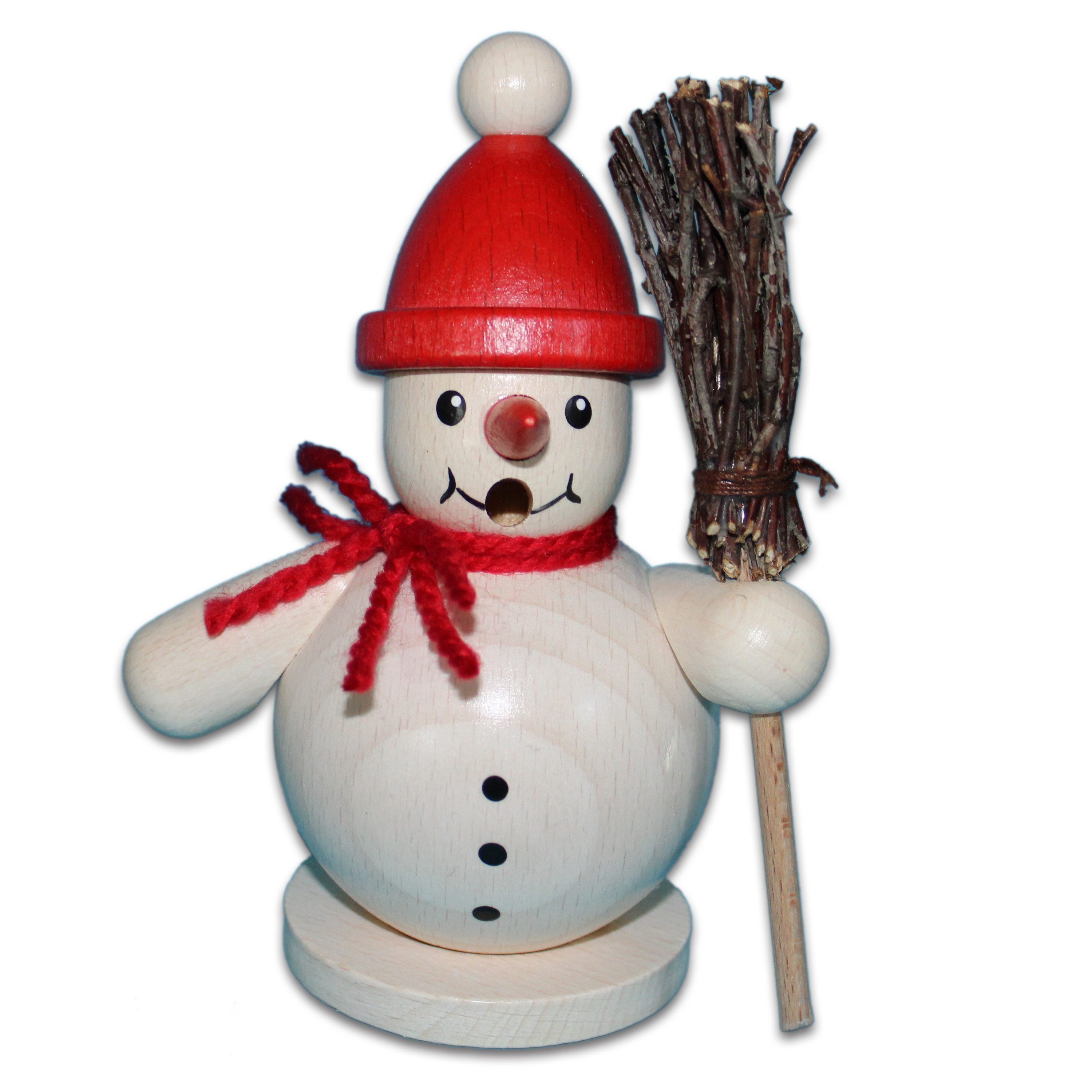 Der hölzerne Räuchermann in Form eines Schneemanns ist eine bezaubernde und winterliche Dekoration, die sowohl als Schmuckstück als auch als Räucherkerzenhalter fungiert. Aus Holz gefertigt und liebevoll verarbeitet, vermittelt der Schneemann eine traditionelle, handgefertigte Ausstrahlung. Seinen Hut und Schal trägt in leuchtendem Rot.