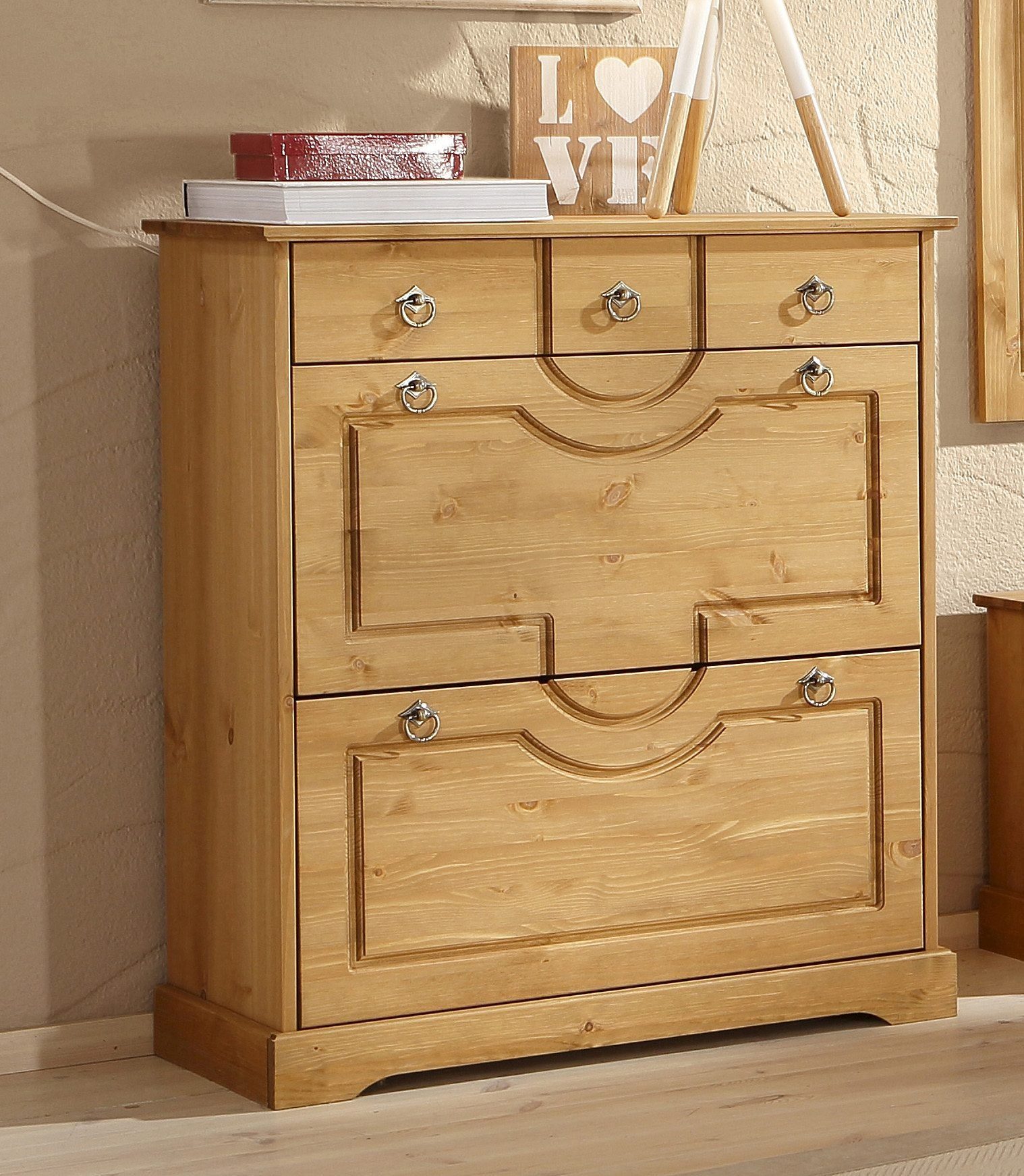 | Wissenswertes | Schuhkommode »Klera«. Diese tolle Kommode im Landhaus-Stil bietet Ihnen und Ihren Gästen einen schönen Empfang. Ein besonderes Detail sind die dekorativen Fräsungen auf der Front. Die Schuhkommode ist gefertigt aus FSC®-zertifizierter, massiver Kiefer, wahlweise in Natur gebeizt und geölt, dunkelbraun gebeizt und lackiert oder weiß gebeizt und lackiert. Griffe aus bronzefarbenem Metall. Oben befindet sich ein großer Schubkasten auf Metallauszug (optisch 3 Schubkästen), Innenmaße (B/T/H): 63/32/11,5 cm. Darunter bieten 2 Klappen (öffnen nach unten) Platz für Ihre Lieblingsschuhe. Hinter je einer Klappe befindet sich eine dreifache Schuhhalterung. Insgesamt geeignet für ca. 18 Paar Schuhe bis Größe 43. Außenmaße (B/T/H): 81/37/93 cm. Artikeldetails: