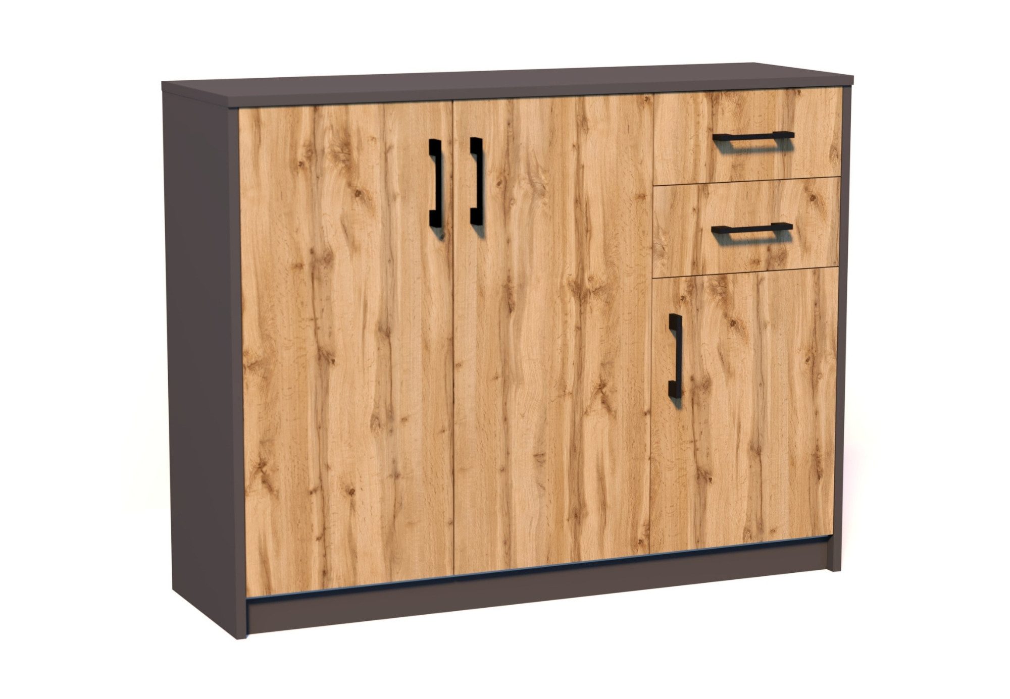 Diese Kommode bietet eine perfekte Kombination aus Stil und Funktionalität, was sie zu einer idealen Ergänzung für jeden Raum macht. Mit drei Türen und zwei geräumigen Schubladen entworfen, bietet sie reichlich Stauraum für all Ihre Utensilien. Die Kommode ist aus 16mm dicken laminierten Platten gefertigt, was Langlebigkeit und eine robuste Struktur gewährleistet. Die Vorderkante der Tischplatte ist mit Soft-Technologie gestaltet, was ihr eine glatte, abgerundete Oberfläche verleiht und dem Gesamtbild einen Hauch von Eleganz hinzufügt.