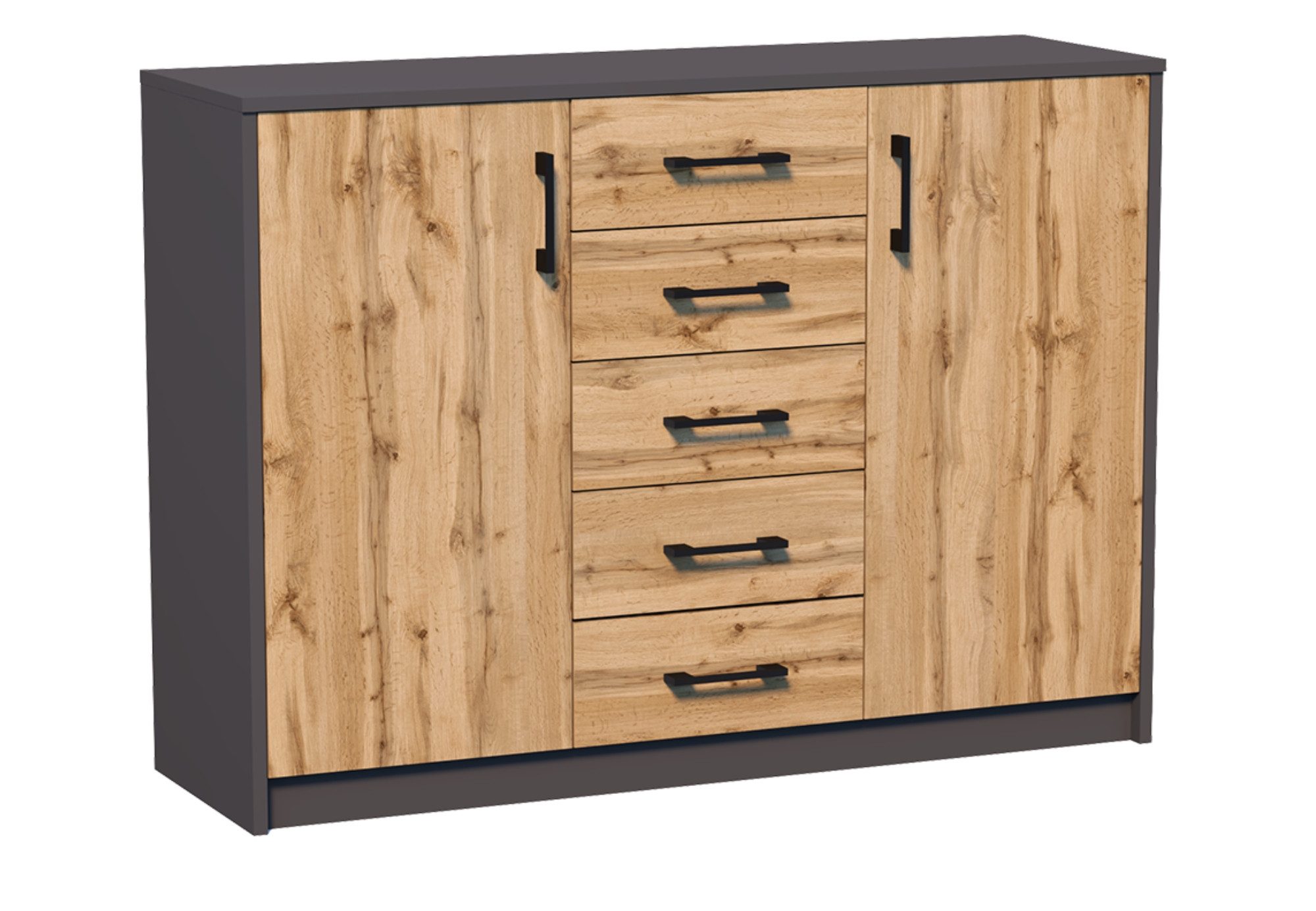 Diese Kommode vereint Stil und Funktionalität und bietet mit ihren 5 Schubladen und 2 Regalen reichlich Stauraum. Sie ist aus einer robusten, laminierten Platte gefertigt und verspricht Langlebigkeit bei gleichzeitig modernem Design. Die Vorderkante der Tischplatte ist mit der abgerundeten Soft-Technologie ausgestattet, die sowohl Sicherheit als auch Eleganz gewährleistet. Die Schubladen gleiten sanft auf Metallrollenführungen mit Auszugsstopp, sodass Sie mühelos auf Ihre Gegenstände zugreifen können. Hochwertige Polymergriffe unterstreichen das schlanke Erscheinungsbild der Kommode, während das matte Finish jedem Raum einen Hauch von Raffinesse verleiht. Ob Sie zusätzlichen Stauraum für Kleidung, Accessoires oder andere wichtige Dinge benötigen, diese Kommode ist eine praktische und stilvolle Lösung.