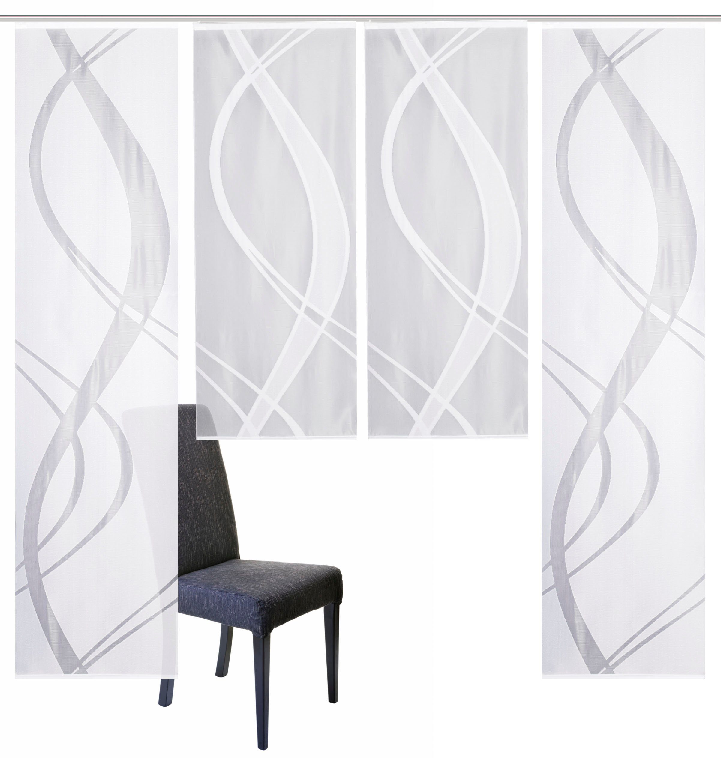 4er Set Schiebevorhang aus weißer Jacquard-Wirkware. Bestehend aus 2 Schiebevorhängen mit blickdichtem Grund und 2 Schiebevorhängen mit transparentem Grund und dichtem Wellen-Motiv. Der Schiebevorhang TIBASO verbindet klassische Jacquard-Wirkware mit modernem Motiv und ist ein echter Eyecatcher an Ihrem Fenster. Oben mit Kunststoffträgerschiene mit eingehängten X-Gleitern und Gardinenröllchen (passend für alle gängigen Gardinenschienen), unten mit Beschwerungsstange, seitlich geschnitten vollendet der Schiebevorhang seine hochwertige Optik. verpackt in Polytüte, Pflegeleicht, da 100% Polyester. Die Größenangabe bezieht sich auf jeden einzelnen Schiebevorhang. Ideal für eine Fensterbreite von 175-235 cm. Made in Germany.