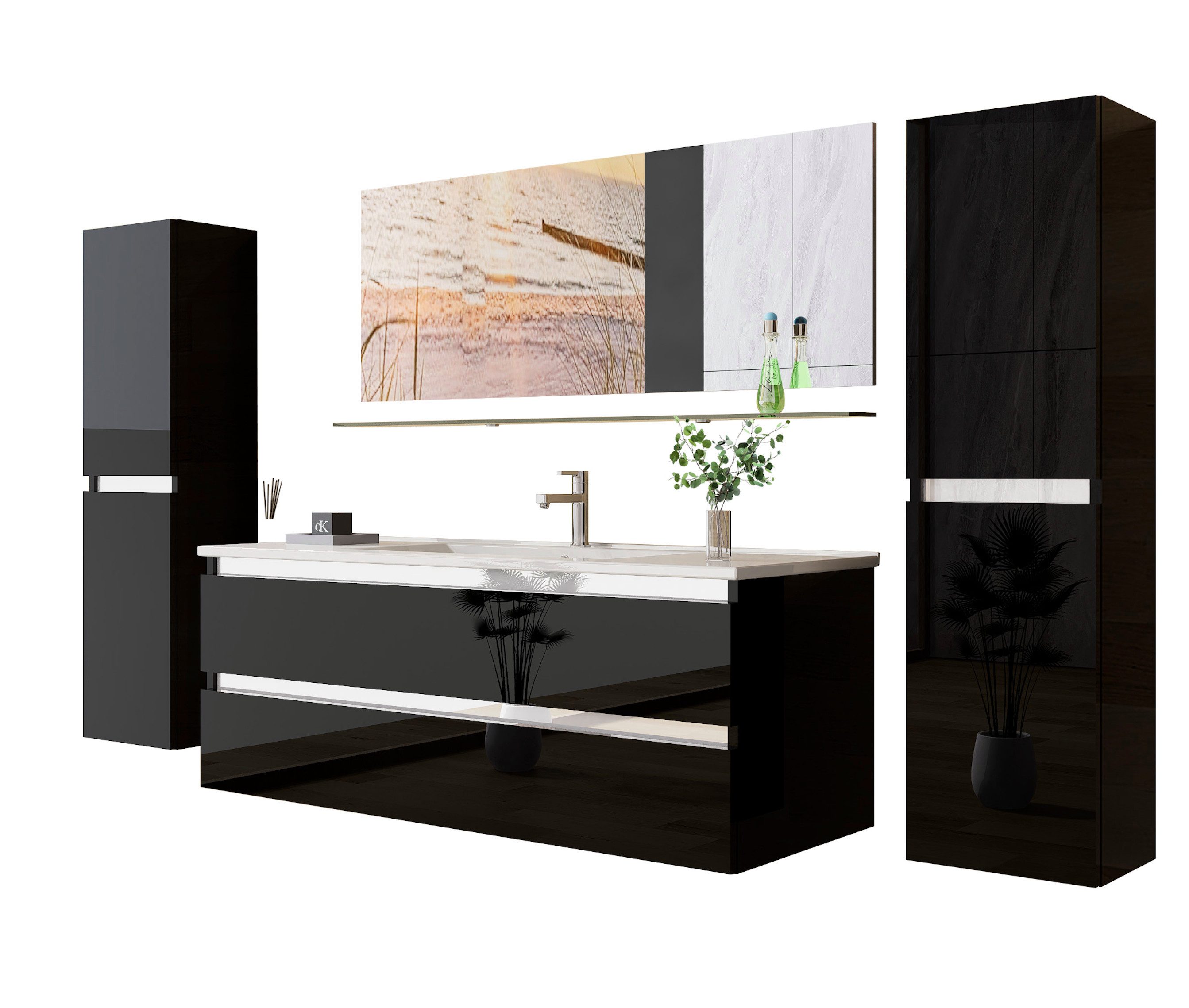 ***** 120 cm Badmöbel Set Bis 8 Teilig Marcel Schwarz Hochglanz Komplett *****