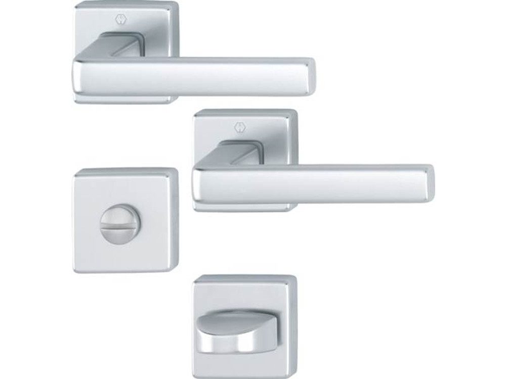 Rosettengrt.Dublin 1124/843KV/843KVS Alu.F1 eck.SK/OL DIN L/R D/D HOPPE Rosetten-Türgriff-Garnitur mit Schlüsselrosetten für Innentüren: Lagerung: Türgriffe fest/drehbar, Rückholfedern, wartungsfreie Gleitlager Verbindung: HOPPE-Vollstift · Unterkonstruktion: Kunststoff, Stütznocken Befestigung: verdeckt, durchgehend, wechsel