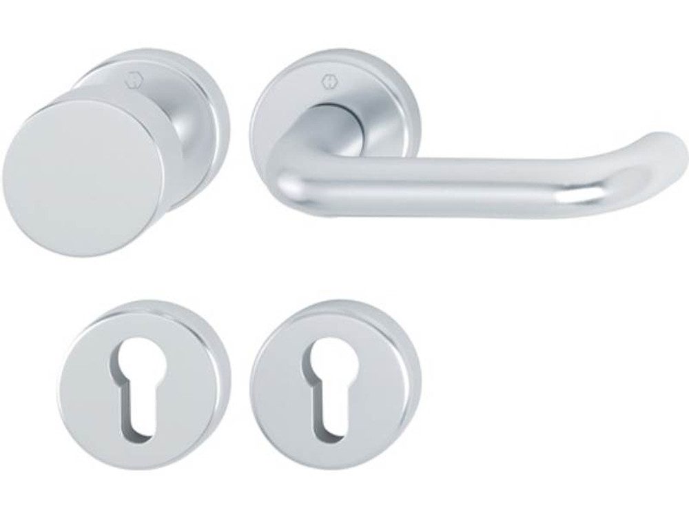 Rosettengrt.Paris 58/42KV/42KVS/138L Alu.F1 U-Form PZ DIN L/R fl.D/K HOPPE Innentür-Rosetten-Garnitur geprüft nach DIN EN 1906 (Gebrauchs-Kategorie Klasse 3) · Türgriffe mit Schnellstift-Verbindung (mit 8 mm Vollstift) · Rosetten mit Kunststoff-Unterkonstruktion, Rückholfeder und Stütznocken · verdeckte, durchgehende Verschraubu