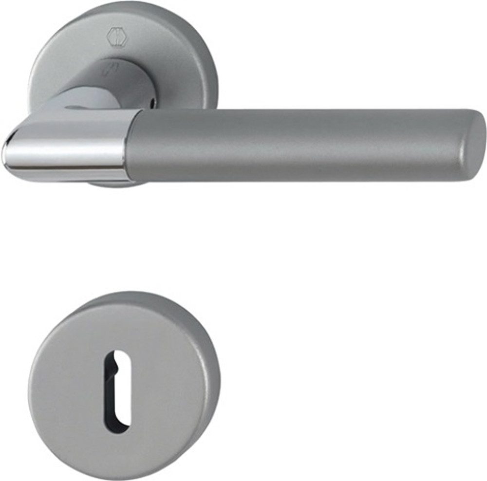 Rosettengrt.Lecce 1405/42KV/42KVS Alu.F49/F9-2 rd.OB DIN L/R D/D HOPPE Innentür-Rosetten-Garnitur geprüft nach DIN EN 1906 (Gebrauchs-Kategorie Klasse 3) · Türgriffe mit Schnellstift-Verbindung (8 mm Vierkant) und Rückholfeder · Rosetten mit Stütznocken unsichtbar verschraubt · Messing verchromt / Aluminium Stahl matt · Ansc