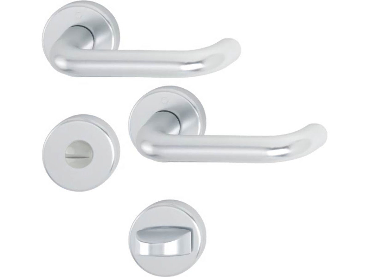 Rosettengrt.Paris 138L/42KV/42KVS Alu.F1 U-Form SK/OL DIN L/R D/D HOPPE Innentür-Rosetten-Garnitur geprüft nach DIN EN 1906 (Gebrauchs-Kategorie Klasse 3) · Türgriffe mit Schnellstift-Verbindung (mit 8 mm Vollstift) · Rosetten mit Kunststoff-Unterkonstruktion, Rückholfeder und Stütznocken · verdeckte, durchgehende Verschraubu