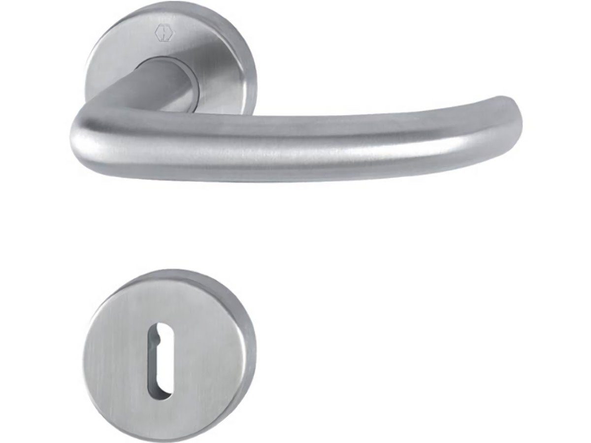 Rosettengrt.San Fran.E1301Z/42KV/42KVS VA F69 U-Form OB DIN L/R D/D HOPPE Innentür-Rosetten-Garnitur nach DIN EN 1906 (Gebrauchs-Kategorie Klasse 3) · Türgriffe mit Schnellstift-Verbindung (mit 8 mm Vollstift) · Rosette mit Kunststoff-Unterkonstruktion, Rückholfeder und Stütznocken · Befestigung verdeckt, durchgehend · wechsels