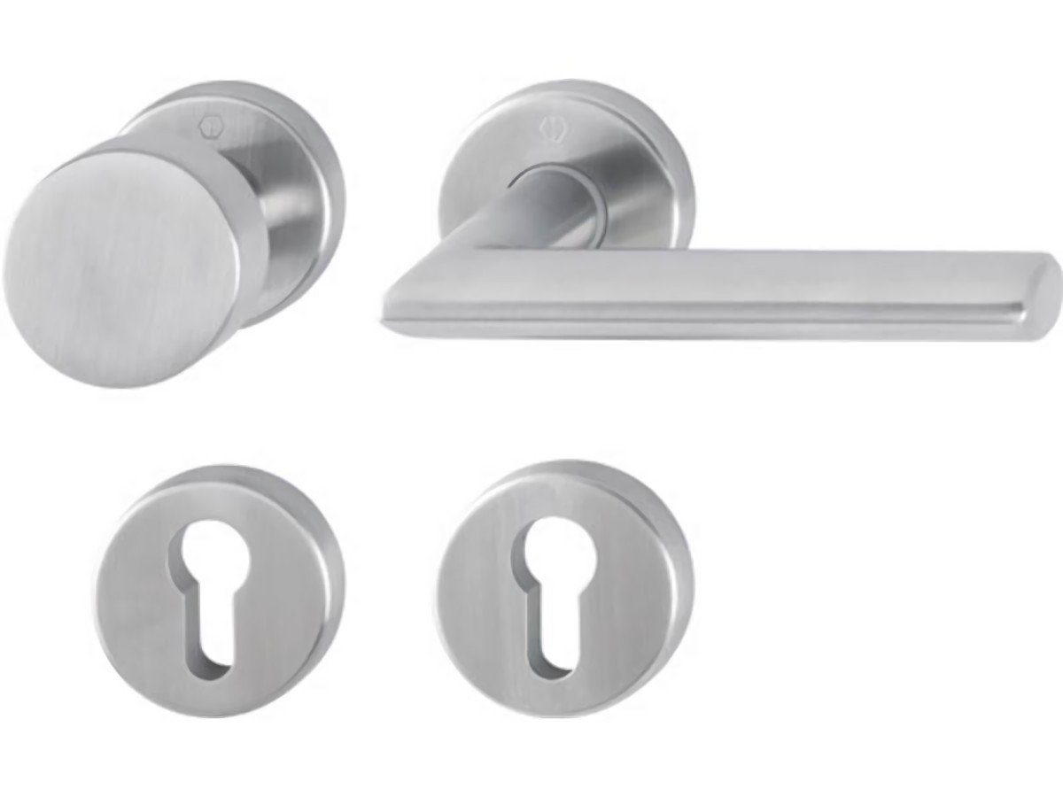 Rosettengrt.Stock.E58/42KV/42KVS/1140Z VA F69 rd.PZ DIN L/R fl.D/K HOPPE Innentür-Rosetten-Garnitur geprüft nach DIN EN 1906 (Gebrauchs-Kategorie Klasse 3) · Türgriffe mit Schnellstift-Verbindung (mit 8 mm Vollstift) und Rückholfeder · Rosetten mit Stütznocken unsichtbar verschraubt · Drückerlänge bei Aluminium 132 mm, bei Ede