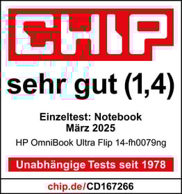 „CHIP.de“ testet das HP OmniBook Ultra Flip 14-fh0079ng im Einzeltest. Die „sehr gute“ Leistung überzeugt. Das Notebook hat ein „sehr gutes“, angenehm „helles und farbintensives“ Display. Es ist „gut“ ausgestattet sowie „klein, schlank und leicht“. Zwar ist kein Kartenleser integriert. Allerdings punktet der sehr ausdauernde Akku. Außerdem ist die Handhabung „sehr gut“. Das Notebook erhält die „CHIP“-Note „sehr gut (1,4)“.